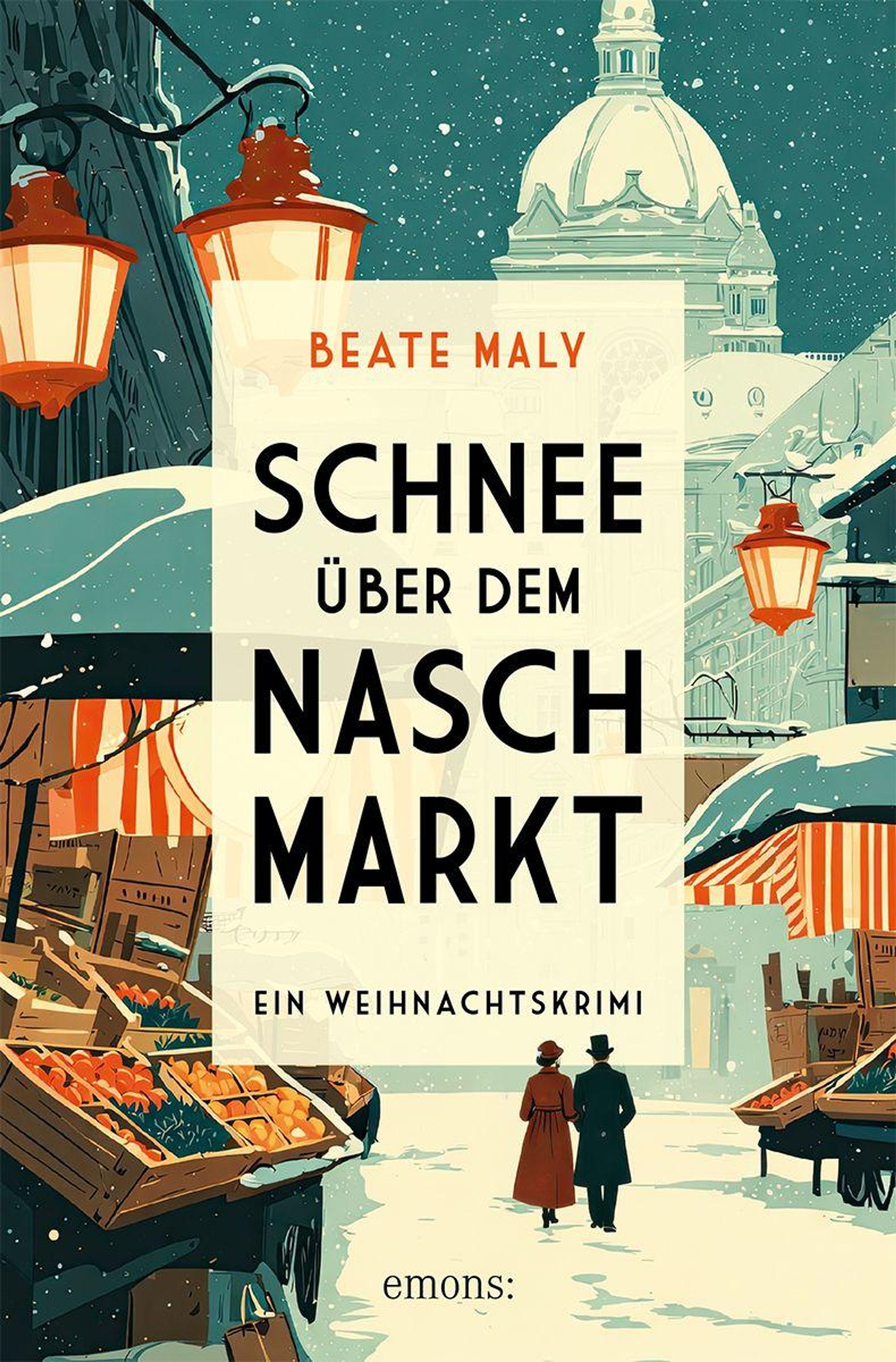 "BEATE MALY SCHNEE ÜBER DEM NASCHMARKT EIN WEIHNACHTSKRIMI emons:" Illustration eines verschneiten Marktplatzes., Buch