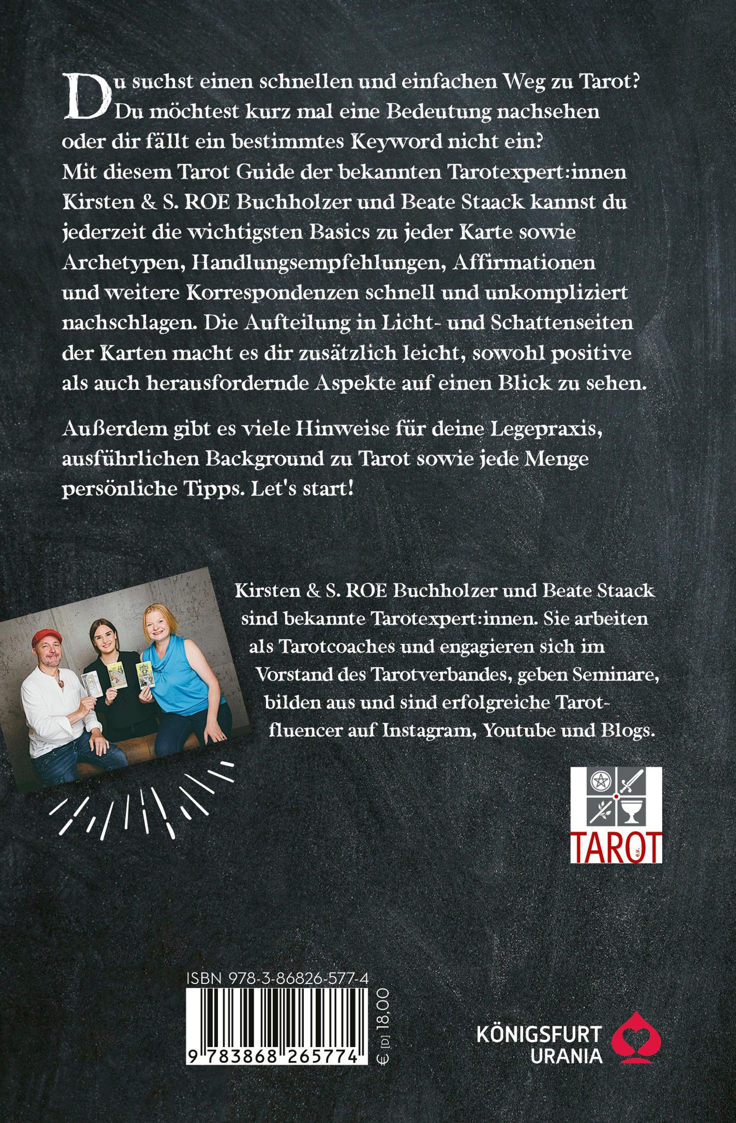 Du suchst einen schnellen und einfachen Weg zu Tarot? Du möchtest kurz mal die Bedeutung einer Karte nachsehen oder dir fällt ein bestimmtes Keyword nicht ein? Mit diesem Tarot Guide der bekannten Tarot-Experten Beate Staack und Kirsten & S. ROE Buchholzer kannst du jederzeit die wichtigsten Basics zu jeder Karte sowie Archetypen, Handlungsempfehlungen, Affirmationen und weitere Korrespondenzen schnell und unkompliziert nachschlagen. Die Aufteilung in Licht- und Schattenseiten der Karten macht es dir zusätzlich leicht, positive und herausfordernde Aspekte auf einen Blick zu sehen. Der ideale Begleiter, den du immer zur Hand haben solltest.