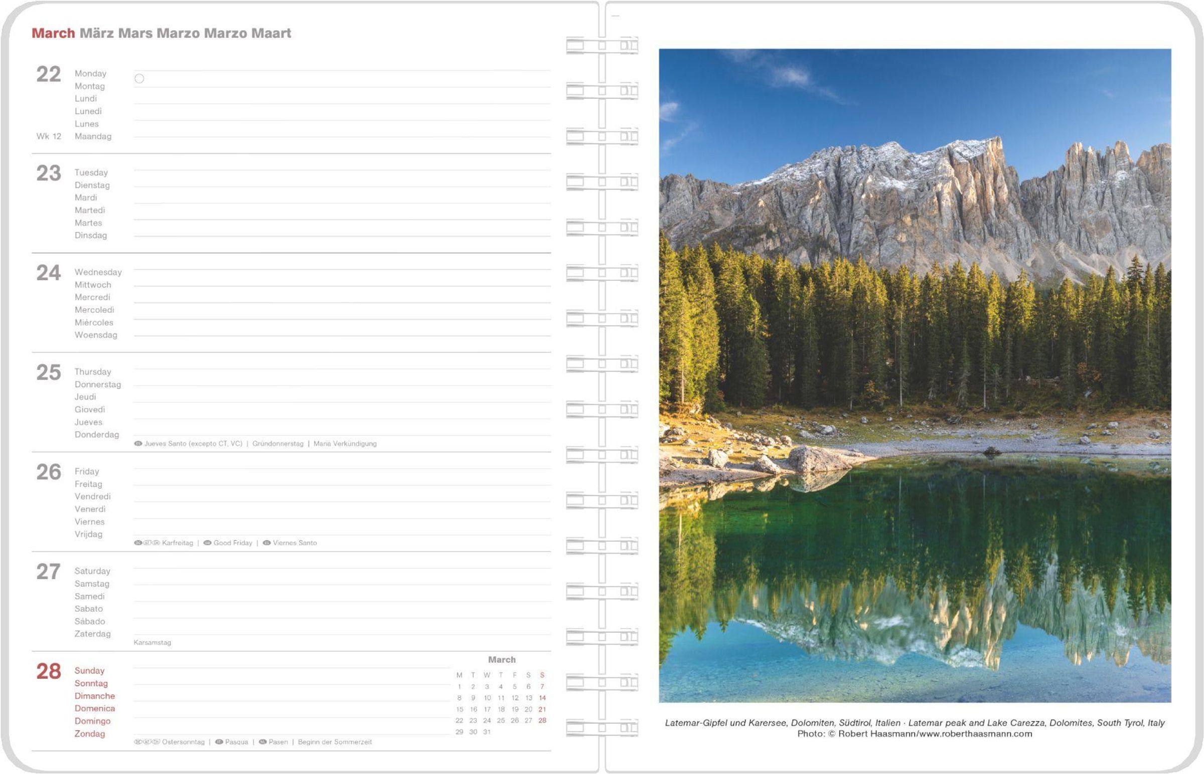 6-sprachiges Kalendarium (DE/EN/FR/IT/ES/NL) mit internationalen Feiertagen