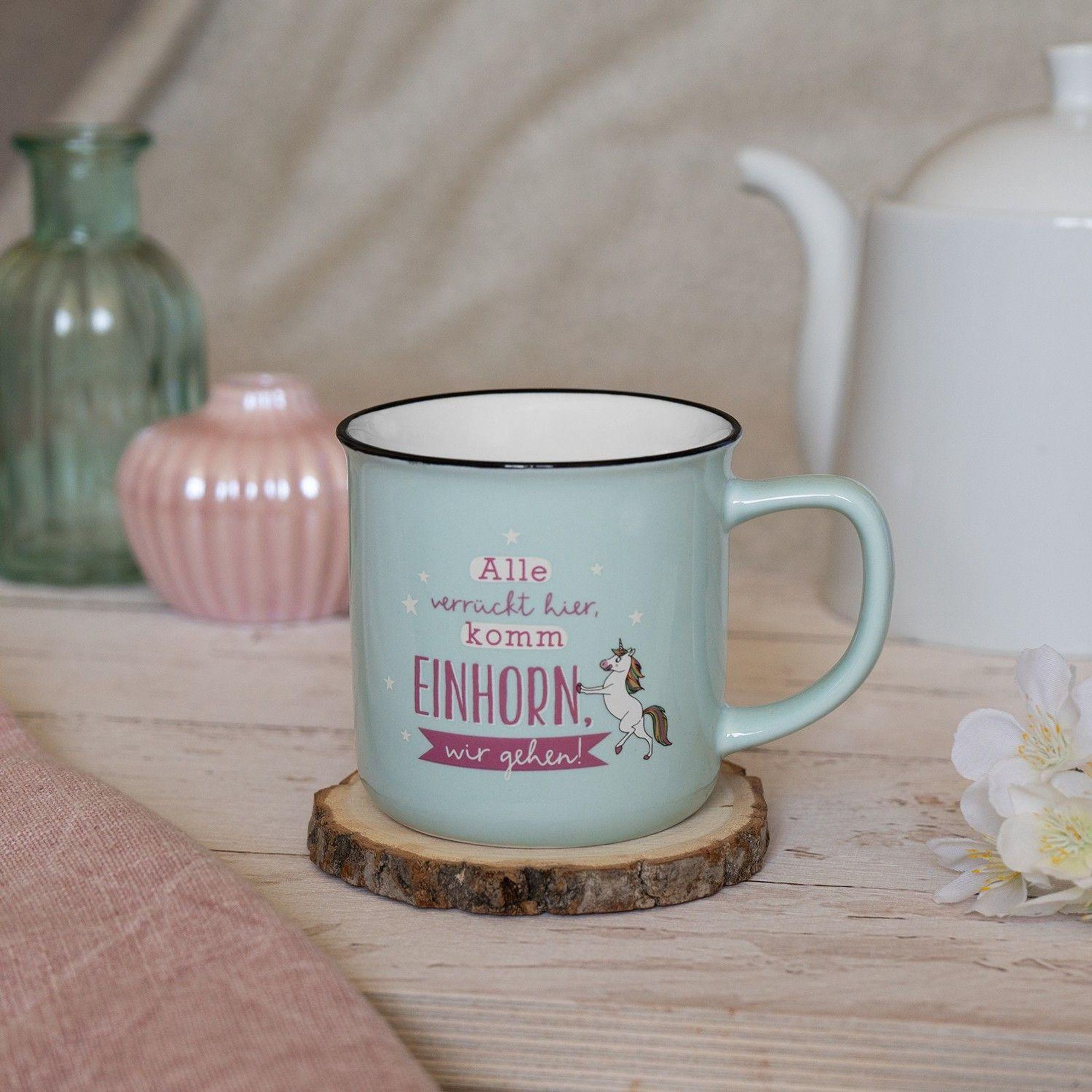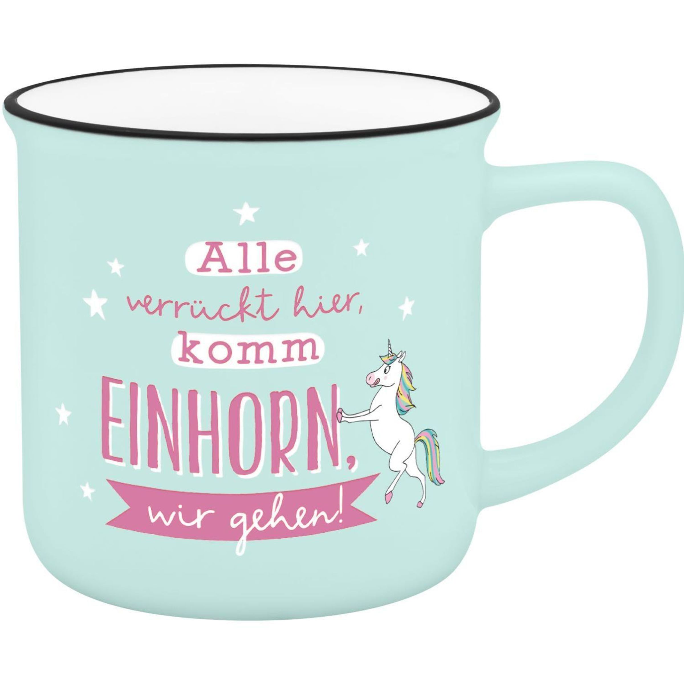 NOSTALGISCHER VINTAGE-LOOK: Tassen, Kaffeebecher und Teetassen in angesagtem Retro-Design, in Emaille-Optik und mit liebevollem Text :-) Dieser Becher mit Spruch im angesagten Nostalgie-Look bringt Farbe und frischen Wind an den gedeckten Tisch, in die Kaffeerunde und ins Büro. TASSE MIT SPRUCH: Becher mit farbigem Motivdruck und mit Spruch "Alle verrückt hier, komm Einhorn wir gehen!", Material New Bone China Porzellan, Volumen 35 cl, Höhe 8, 4 cm, Durchmesser 9 cm, Lieblingsbecher verpackt in passend gestalteter Geschenk-Banderole. VOLL IM TREND: Egal ob Lama, Faultier, Einhorn oder trendige Sprüche, Farben, Formen und Material für einen natürlichen, nachhaltigen Look - wir sorgen dafür, dass die brandaktuellen Trends zuhause, bei Familie, Freunden und den Kollegen landen. IDEALE GESCHENKIDEE: Passend für jeden Anlass als Geschenk, zum Beispiel zum Valentinstag, zum Jahrestag, zum Geburtstag, zu Weihnachten oder einfach so als schönes Mitbringsel. Als Präsent für die Freundin, den Freund, Mama, Papa, Partner, für Sie, für Ihn und auch alle anderen Lieblingsmenschen geeignet.