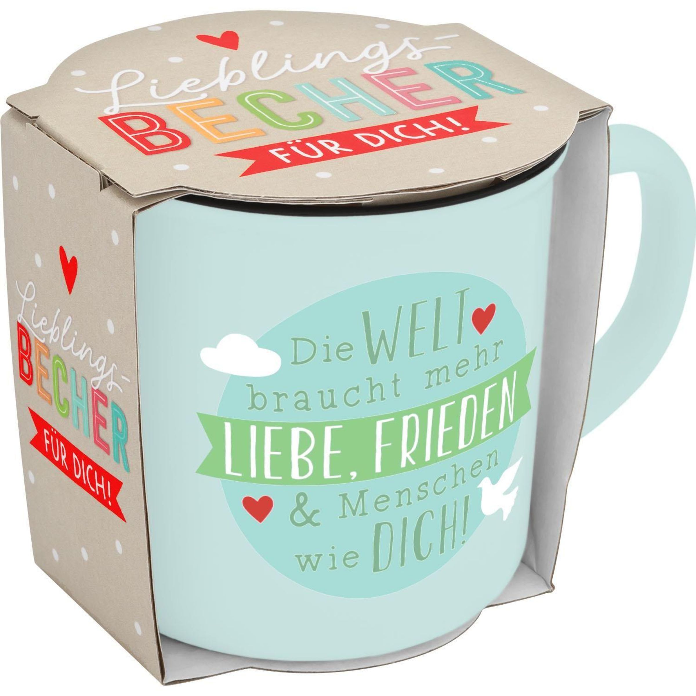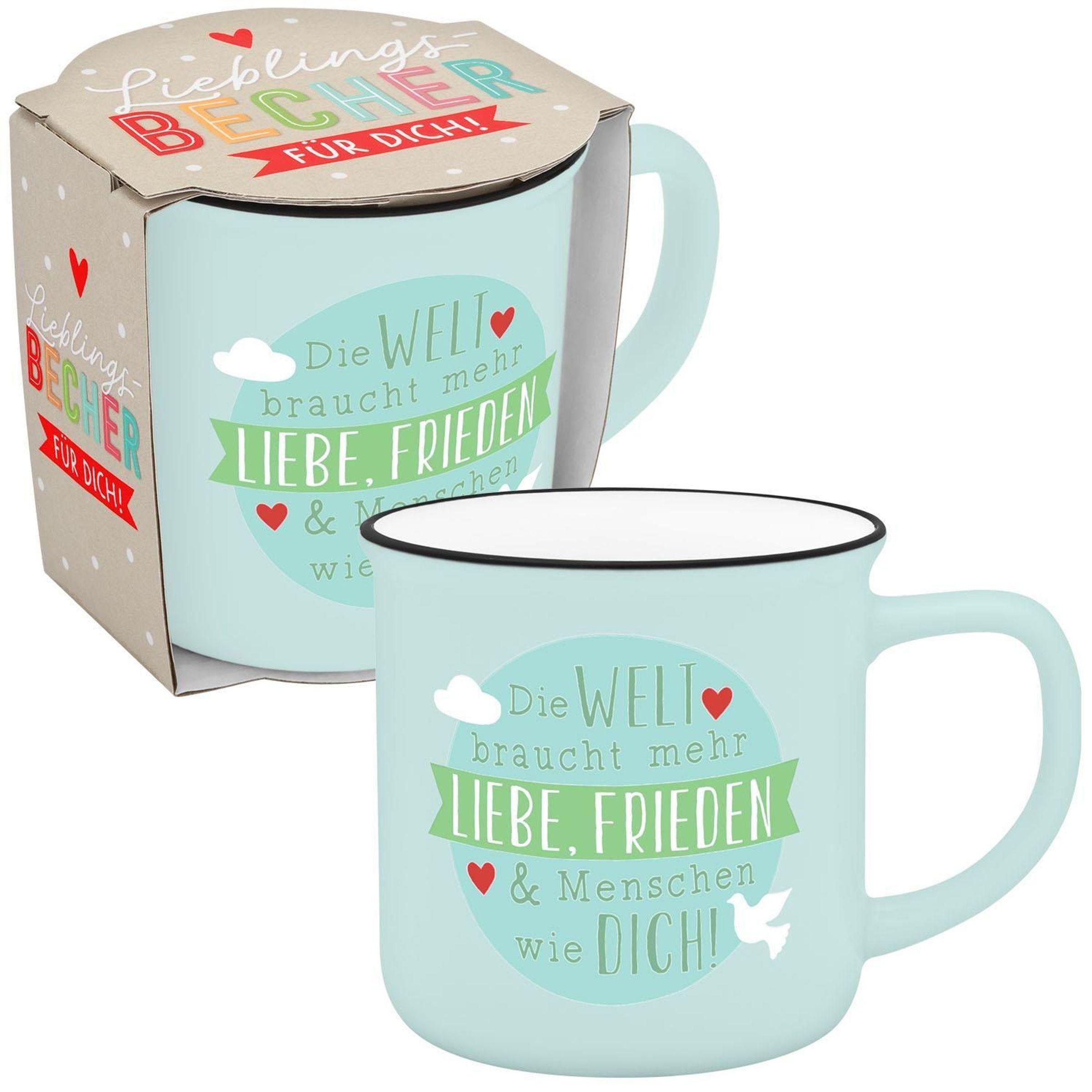 Becher in Emailloptik "Die Welt braucht mehr Liebe, Frieden & Menschen wie dich" (Sonstige Artikel)