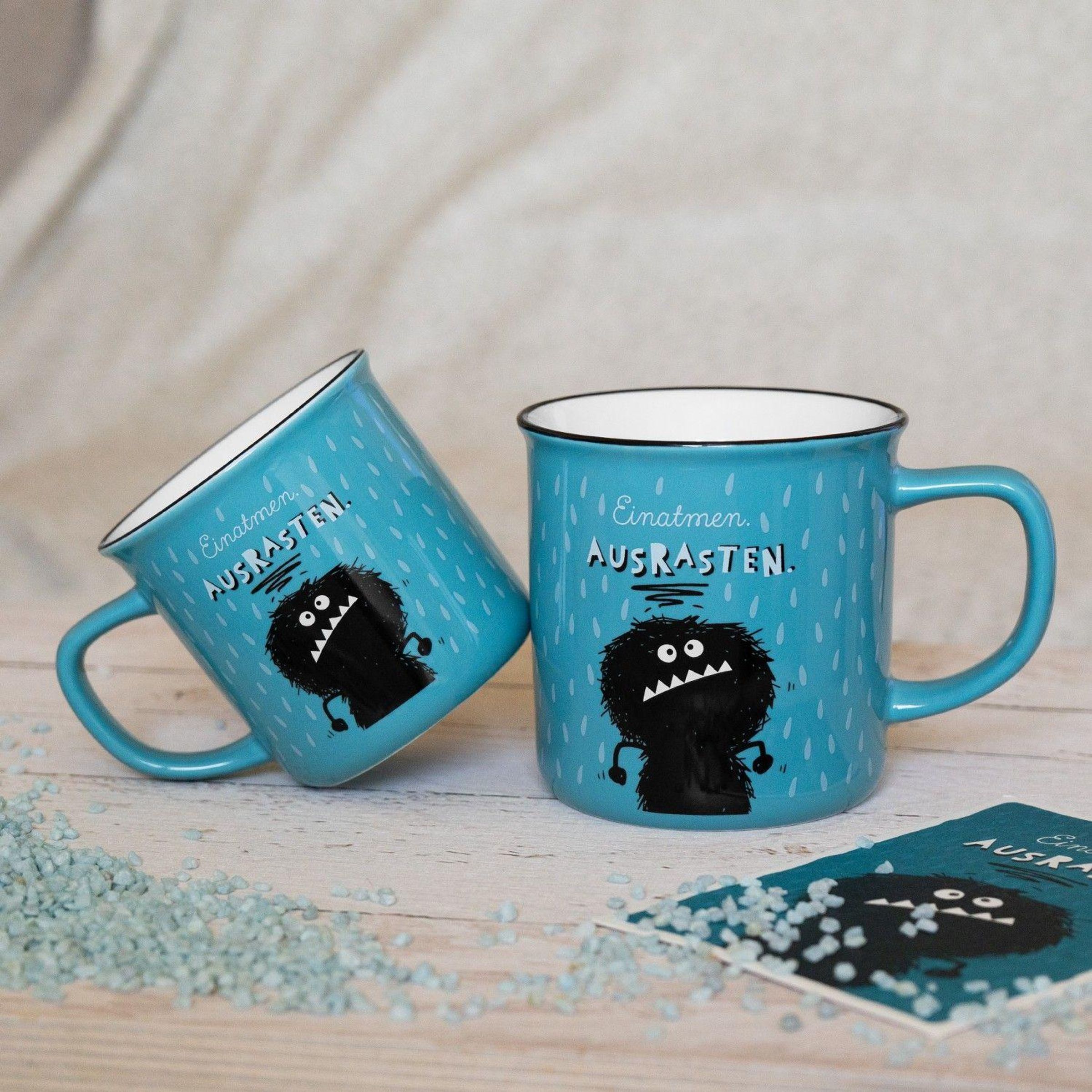 NOSTALGISCHER VINTAGE-LOOK: Tassen, Kaffeebecher und Teetassen in angesagtem Retro-Design, in Emaille-Optik und mit liebevollem Text :-) Dieser Becher mit Spruch im angesagten Nostalgie-Look bringt Farbe und frischen Wind an den gedeckten Tisch, in die Kaffeerunde und ins Büro. TASSE MIT SPRUCH: Becher mit farbigem Moster-Motivdruck und mit Spruch "Ausrasten", Material New Bone China Porzellan, Volumen 35 cl, Höhe 8, 4 cm, Durchmesser 9 cm, Lieblingsbecher verpackt in passend gestalteter Geschenk-Banderole. VOLL IM TREND: Egal ob Lama, Faultier, Einhorn oder trendige Sprüche, Farben, Formen und Material für einen natürlichen, nachhaltigen Look - wir sorgen dafür, dass die brandaktuellen Trends zuhause, bei Familie, Freunden und den Kollegen landen. Valentinstag, zum Jahrestag, zum Geburtstag, zu Weihnachten oder einfach so als schönes Mitbringsel. Als Präsent für die Freundin, den Freund, Mama, Papa, Partner, für Sie, für Ihn und auch alle anderen Lieblingsmenschen geeignet.