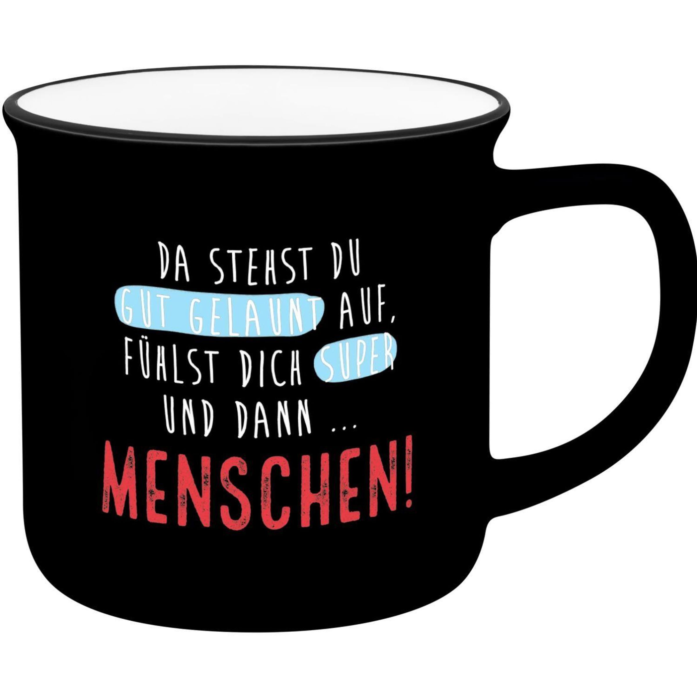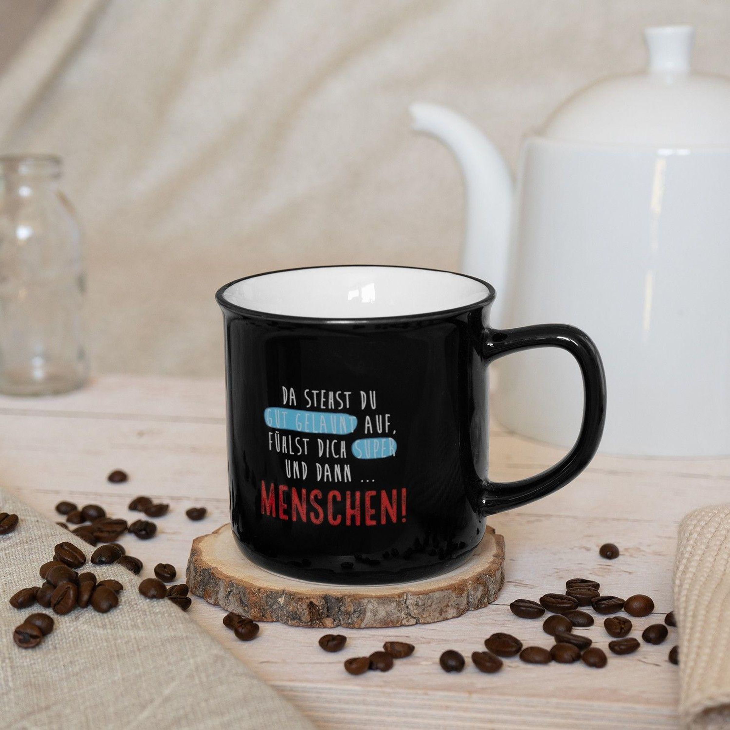 NOSTALGISCHER VINTAGE-LOOK: Tassen, Kaffeebecher und Teetassen in angesagtem Retro-Design, in Emaille-Optik und mit liebevollem Text :-) Dieser Becher mit Spruch im angesagten Nostalgie-Look bringt Farbe und frischen Wind an den gedeckten Tisch, in die Kaffeerunde und ins Büro. TASSE MIT SPRUCH: Becher mit farbigem Motivdruck und mit Spruch "Menschen!", Material New Bone China Porzellan, Volumen 35 cl, Höhe 8, 4 cm, Durchmesser 9 cm, Lieblingsbecher verpackt in passend gestalteter Geschenk-Banderole. VOLL IM TREND: Egal ob Lama, Faultier, Einhorn oder trendige Sprüche, Farben, Formen und Material für einen natürlichen, nachhaltigen Look - wir sorgen dafür, dass die brandaktuellen Trends zuhause, bei Familie, Freunden und den Kollegen landen. IDEALE GESCHENKIDEE: Passend für jeden Anlass als Geschenk, zum Beispiel zum Valentinstag, zum Jahrestag, zum Geburtstag, zu Weihnachten oder einfach so als schönes Mitbringsel. Als Präsent für die Freundin, den Freund, Mama, Papa, Partner, für Sie, für Ihn und auch alle anderen Lieblingsmenschen geeignet.