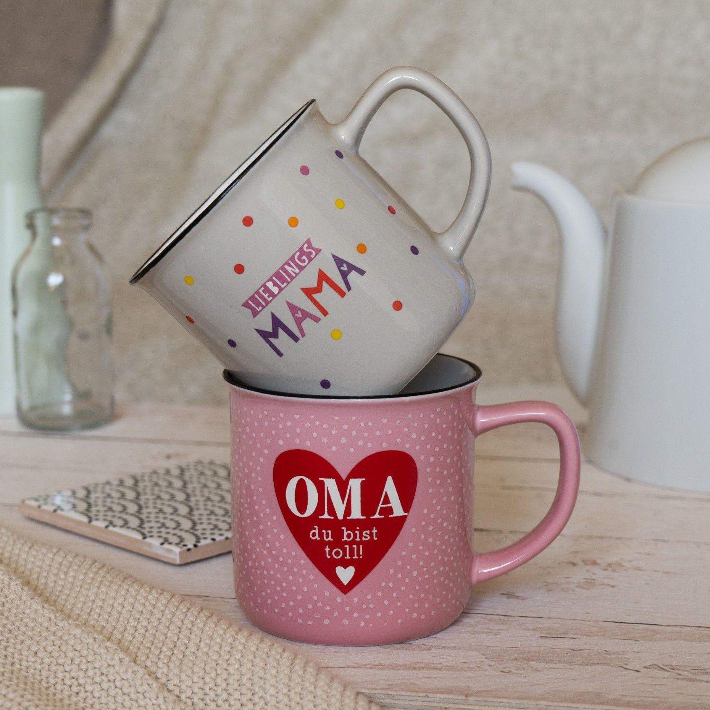 NOSTALGISCHER VINTAGE-LOOK: Tassen, Kaffeebecher und Teetassen in angesagtem Retro-Design, in Emaille-Optik und mit liebevollem Text :-) Dieser Becher mit Spruch im angesagten Nostalgie-Look bringt Farbe und frischen Wind an den gedeckten Tisch, in die Kaffeerunde und ins Büro. TASSE MIT SPRUCH: Becher mit farbigem Motivdruck und mit Spruch "Oma du bist toll", Material New Bone China Porzellan, Volumen 35 cl, Höhe 8, 4 cm, Durchmesser 9 cm, Lieblingsbecher verpackt in passend gestalteter Geschenk-Banderole. VOLL IM TREND: Egal ob Lama, Faultier, Einhorn oder trendige Sprüche, Farben, Formen und Material für einen natürlichen, nachhaltigen Look - wir sorgen dafür, dass die brandaktuellen Trends zuhause, bei Familie, Freunden und den Kollegen landen. IDEALE GESCHENKIDEE: Passend für jeden Anlass als Geschenk, zum Beispiel zum Valentinstag, zum Jahrestag, zum Geburtstag, zu Weihnachten oder einfach so als schönes Mitbringsel. Als