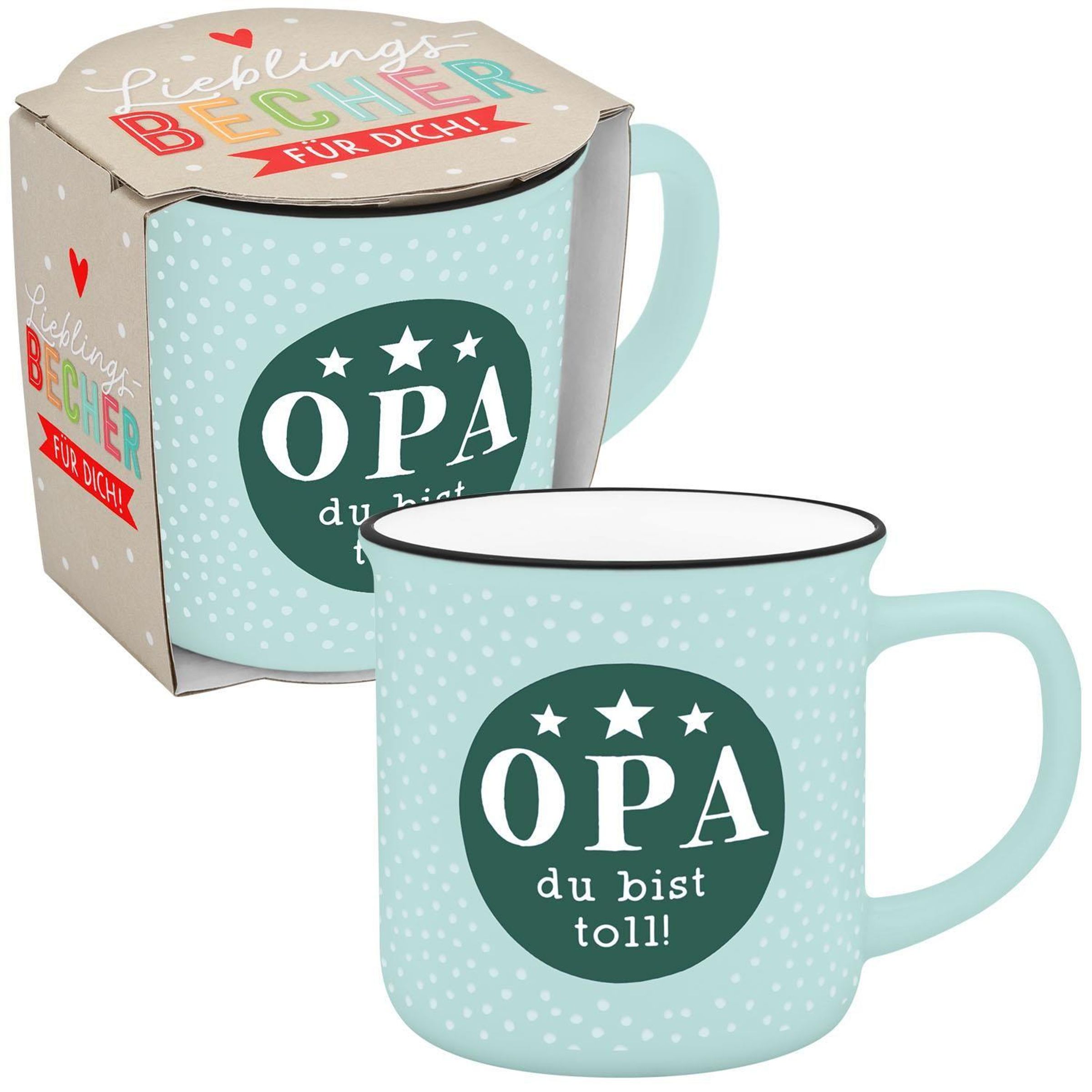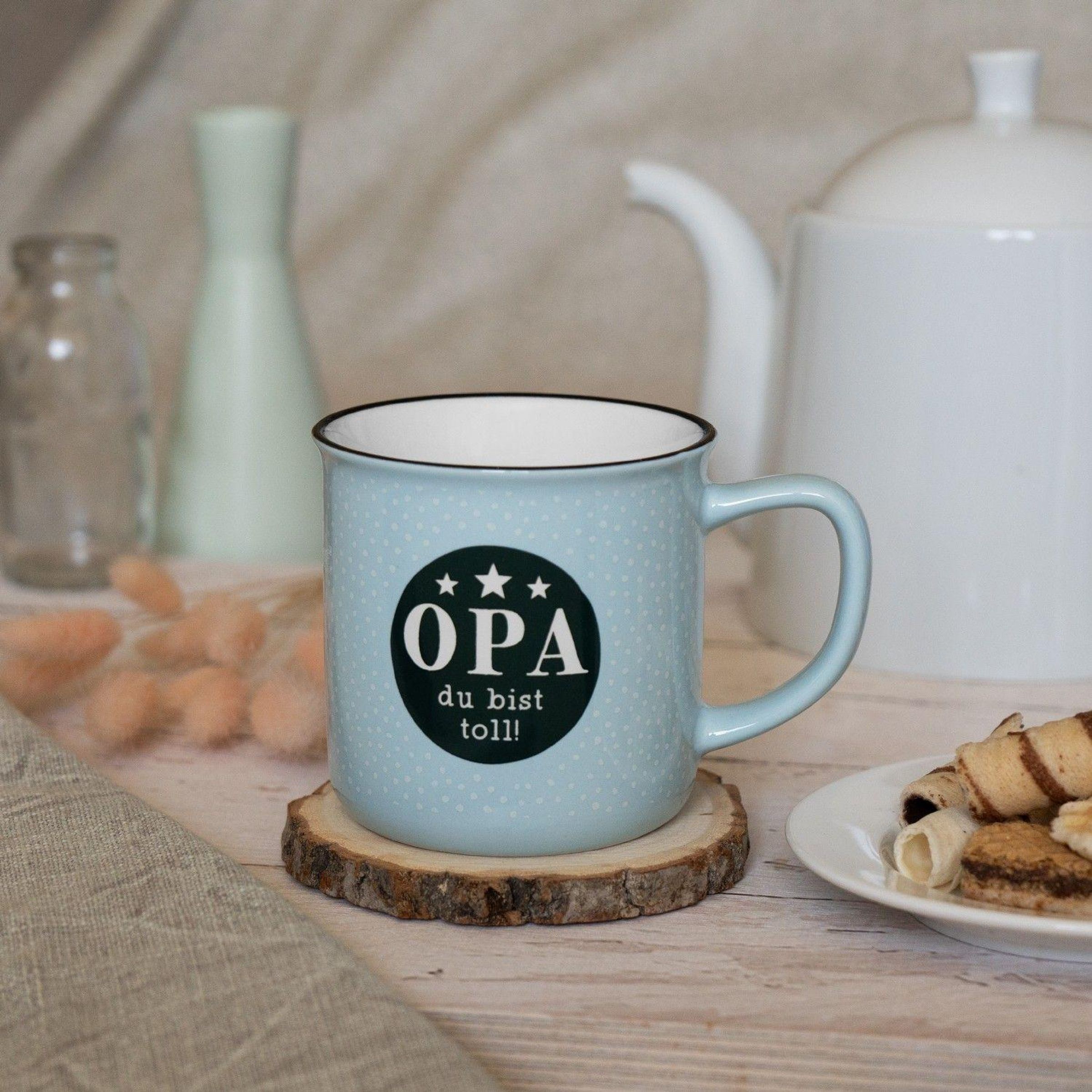 NOSTALGISCHER VINTAGE-LOOK: Tassen, Kaffeebecher und Teetassen in angesagtem Retro-Design, in Emaille-Optik und mit liebevollem Text :-) Dieser Becher mit Spruch im angesagten Nostalgie-Look bringt Farbe und frischen Wind an den gedeckten Tisch, in die Kaffeerunde und ins Büro. TASSE MIT SPRUCH: Becher mit farbigem Motivdruck und mit Spruch "Opa du bist toll", Material New Bone China Porzellan, Volumen 35 cl, Höhe 8, 4 cm, Durchmesser 9 cm, Lieblingsbecher verpackt in passend gestalteter Geschenk-Banderole. VOLL IM TREND: Egal ob Lama, Faultier, Einhorn oder trendige Sprüche, Farben, Formen und Material für einen natürlichen, nachhaltigen Look - wir sorgen dafür, dass die brandaktuellen Trends zuhause, bei Familie, Freunden und den Kollegen landen. IDEALE GESCHENKIDEE: Passend für jeden Anlass als Geschenk, zum Beispiel zum Valentinstag, zum Jahrestag, zum Geburtstag, zu Weihnachten oder einfach so als schönes Mitbringsel. Als Präsent für Opa, Partner, für Ihn und auch alle anderen Lieblingsmenschen geeignet.