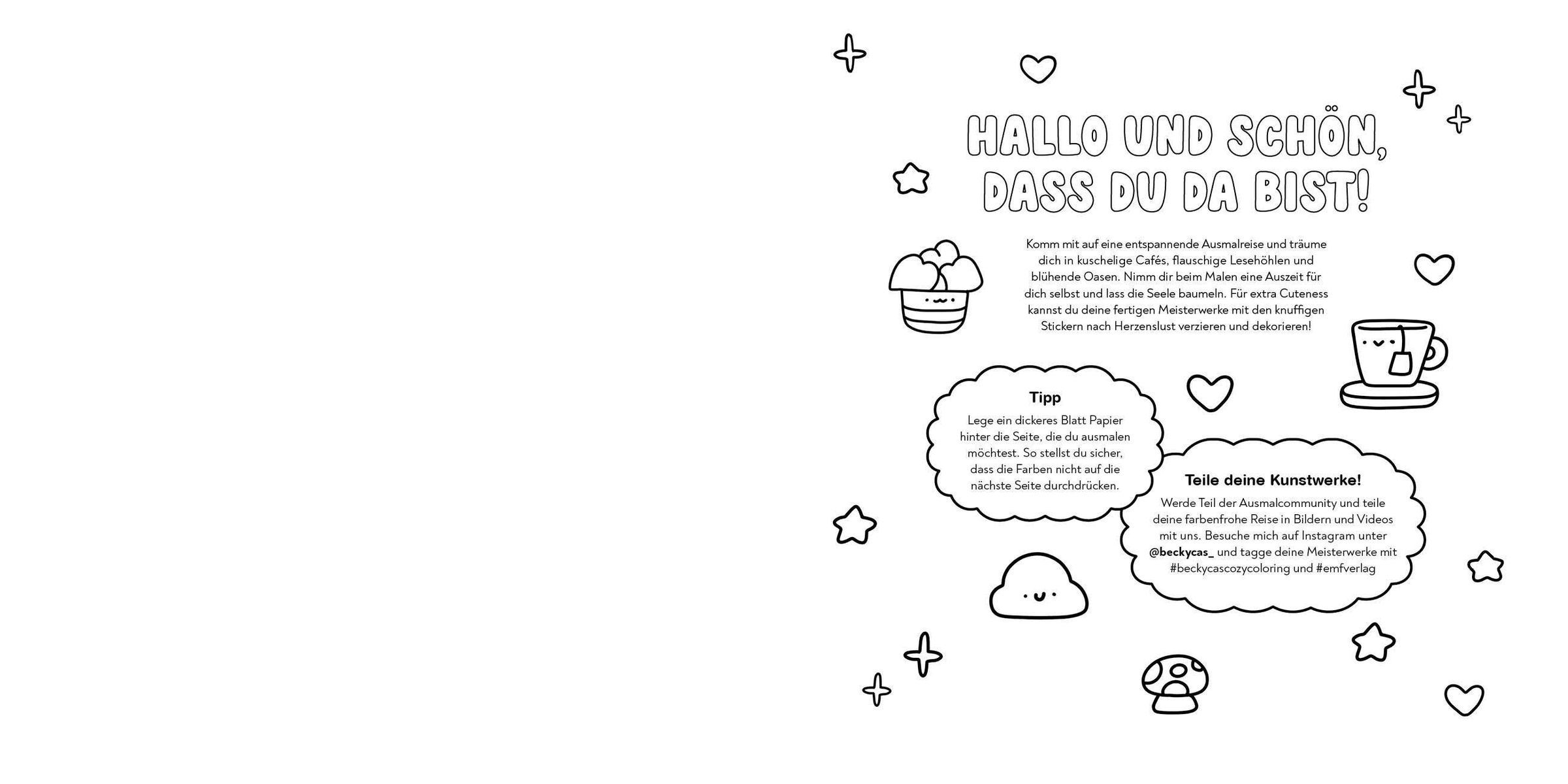 Cozy Coloring Star @beckycas_ entführt dich in liebevoll gestalteten Ausmalszenen in deine ganz persönlichen Wohlfühlecken. Träume dich in kuschlige Cafés, entspannende Hängematten und grüne Oasen. Und das Tollste: Mit den über 100 passenden Stickernkannst du deine fertigen Werke zusätzlich dekorieren und verzieren - für den Extra-Cuteness-Faktor!
