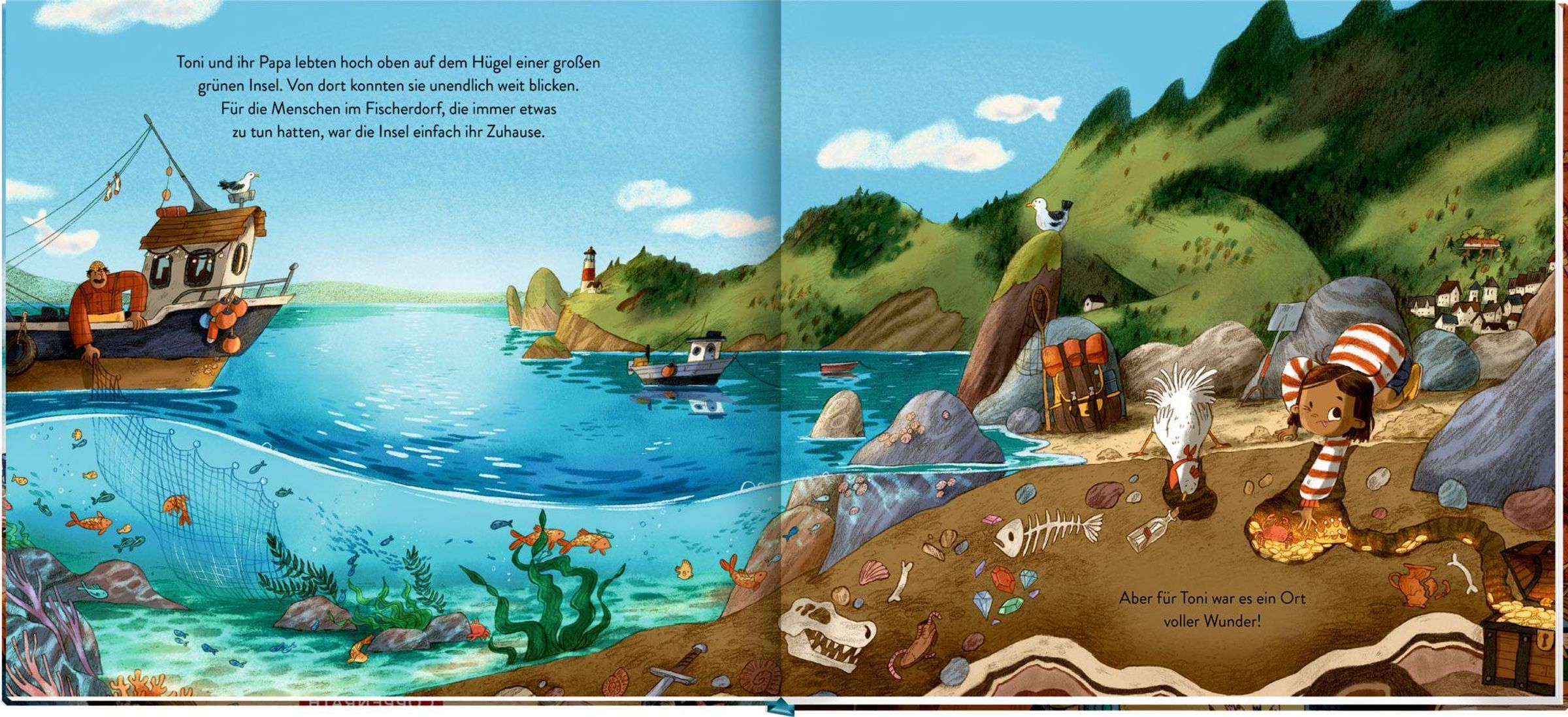 Text: "Tonis Wundersame Insel", "Becky Colvin", "Coppenrath". Illustration: Kind mit Kescher am Strand, Möwen, Felsen, Meer., Buch