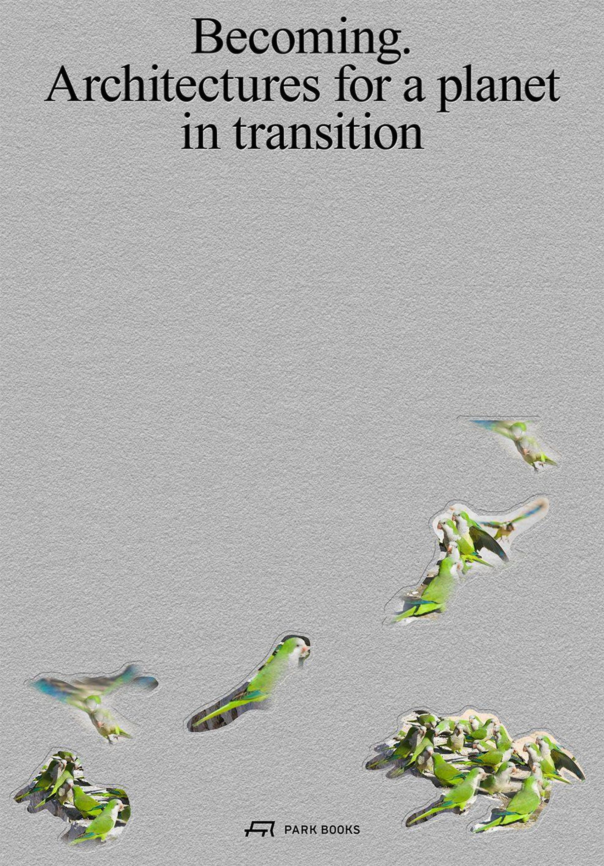 Text: "Becoming. Architectures for a planet in transition". Illustration: Grüne Vögel schimmern durch graue Fläche., Buch