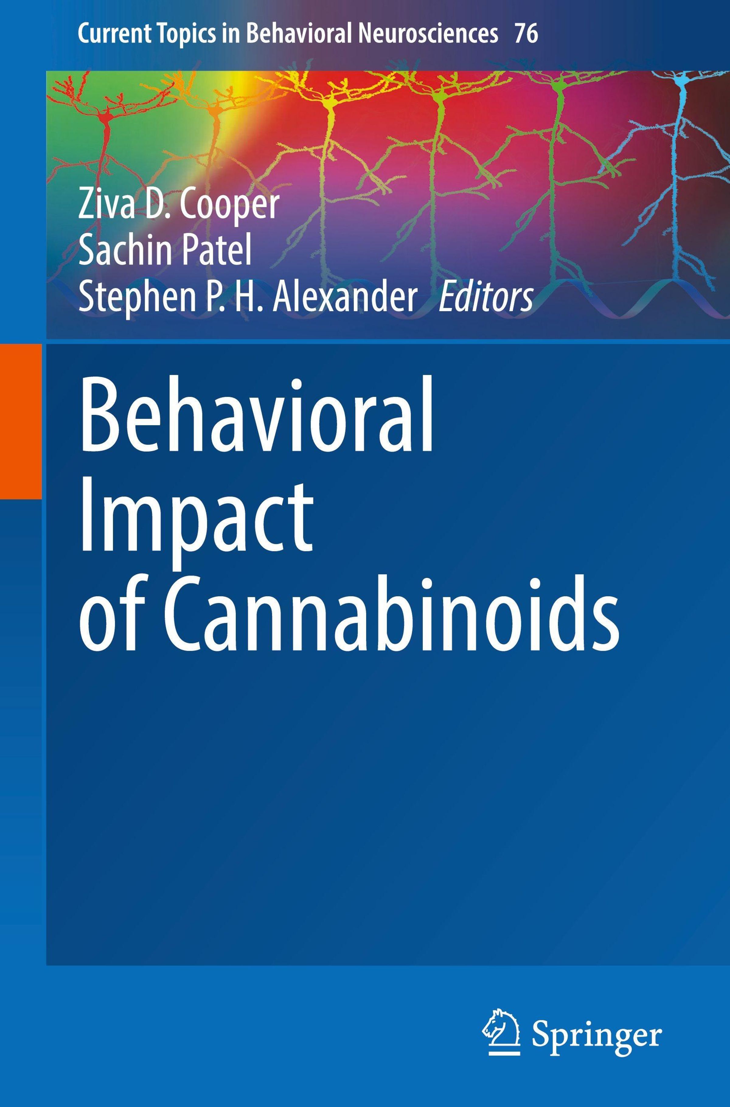Titel: "Behavioral Impact of Cannabinoids". Herausgebernamen oben. Blauer Hintergrund mit neuronalen Mustern oben., Buch