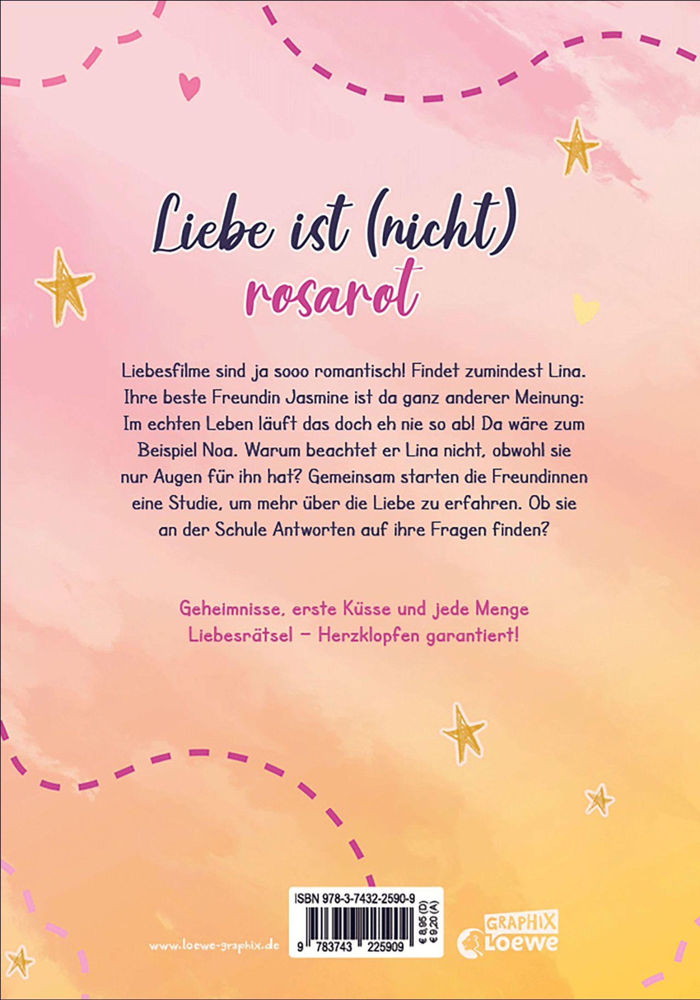 Liebe ist (nicht) rosarot Liebesfilme sind ja sooo romantisch! Findet zumindest Lina. Ihre beste Freundin Jasmine ist da ganz anderer Meinung: Im echten Leben läuft das doch eh nie so ab! Da wäre zum Beispiel Noa. Warum beachtet er Lina nicht, obwohl sie nur Augen für ihn hat? Gemeinsam starten die Freundinnen eine Studie, um mehr über die Liebe zu erfahren. Ob sie an der Schule Antworten auf ihre Fragen finden?