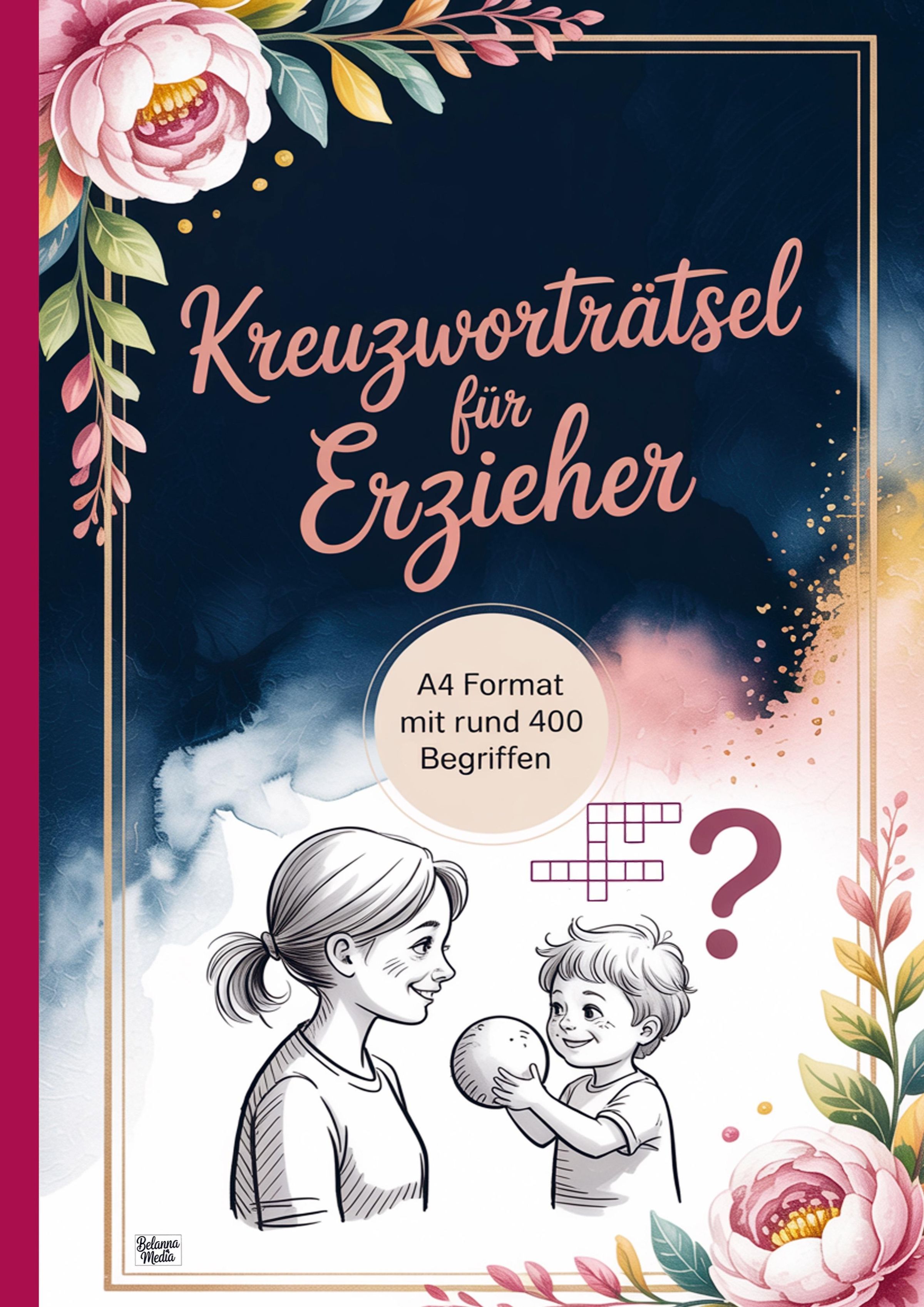 „Kreuzworträtsel für Erzieher“, „A4 Format mit rund 400 Begriffen“. Illustration: Frau und Kind mit Ball, florale Verzierungen., Buch