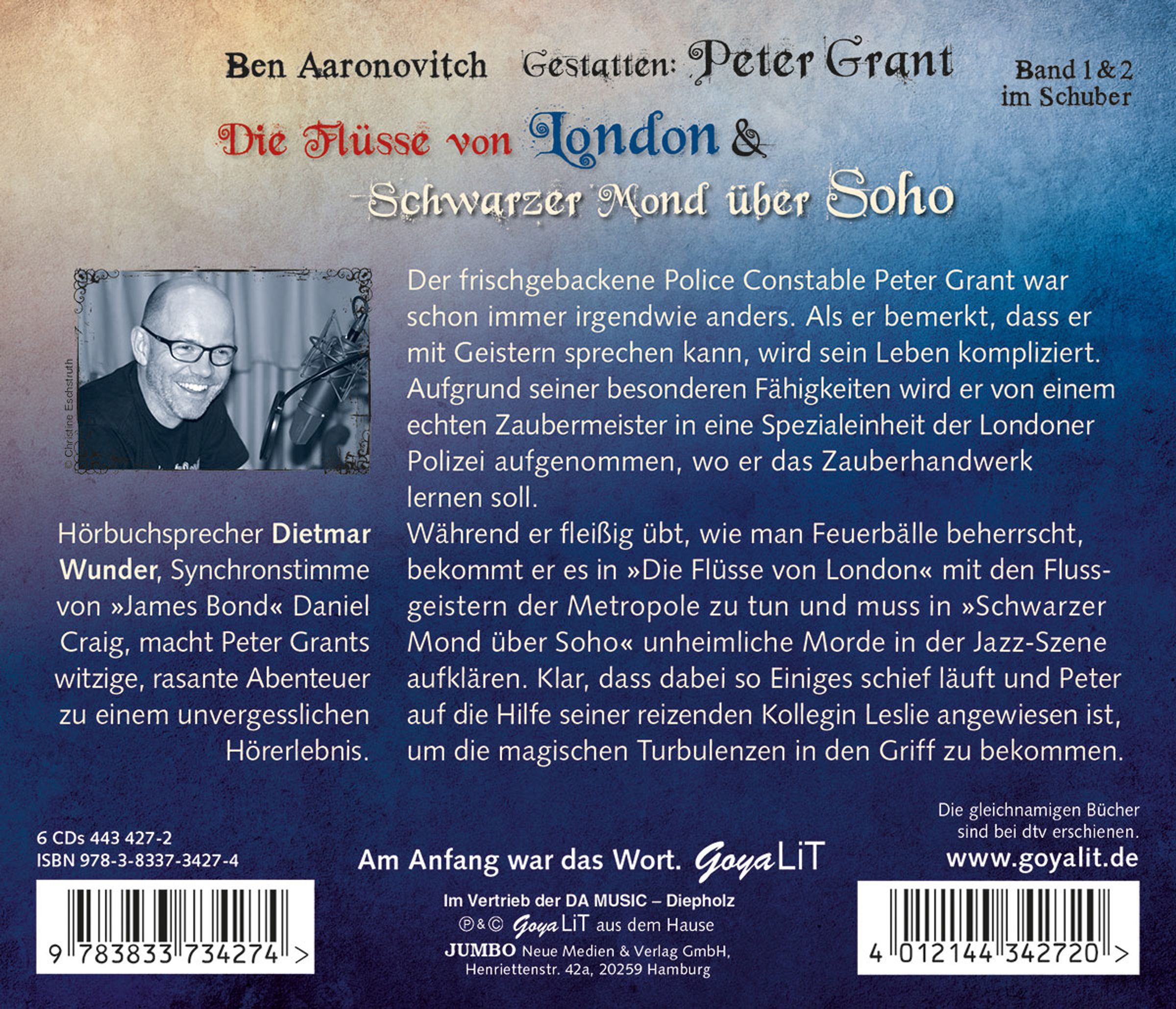 Die Flüsse von London: Der frischgebackene Police Constable Peter Grant war schon immer irgendwie anders. Als er bemerkt, dass er mit Geistern sprechen kann und ein Zaubermeister auf den Plan tritt, wird Peters Leben kompliziert. Schwarzer Mond über Soho: In den Jazzclubs Sohos sterben verdächtig viele Musiker eines unerwarteten Todes. Als Peter zu der Leiche eines Jazzmusikers gerufen wird, die eine Swing-Version von Body and Soul spielt, ist es klar - er ist mitten in seinem zweiten magischen Fall.