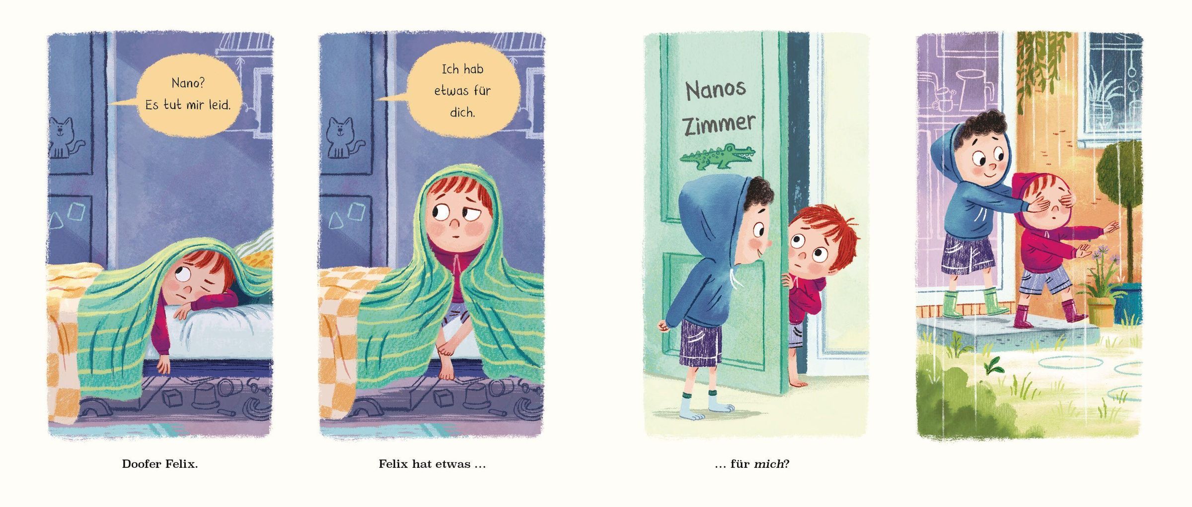 Nano hat seinen großen Bruder Felix ganz doll lieb. Und Nano weiß, dass Felix ihn auch lieb hat - meistens jedenfalls. Doch was tut man, wenn der allertollste große Bruder der Welt einfach nur seine Ruhe haben will? Na, alleine spielen, überhaupt gar kein Problem! Oder etwa doch?!