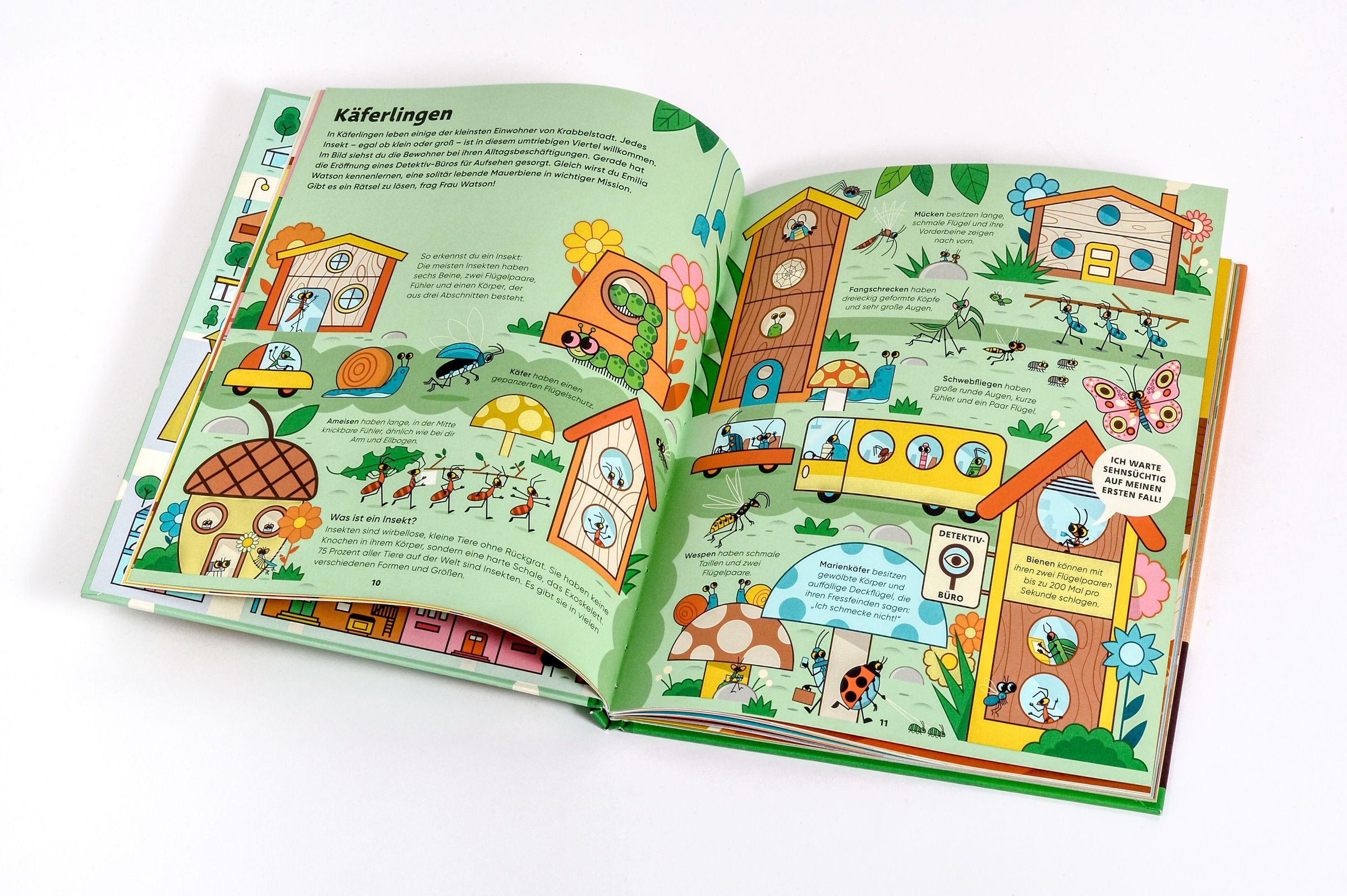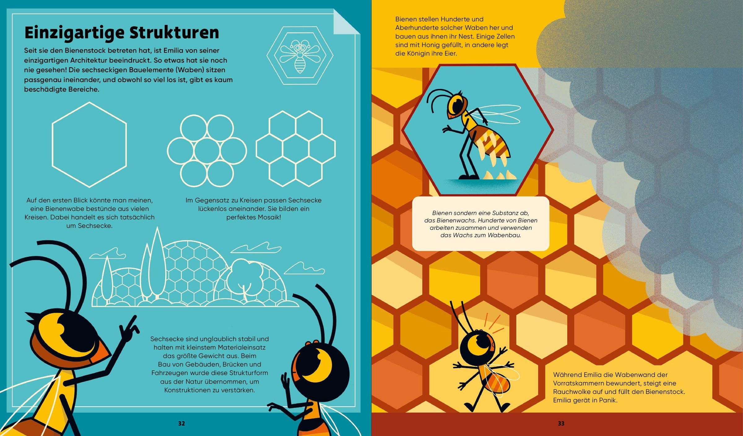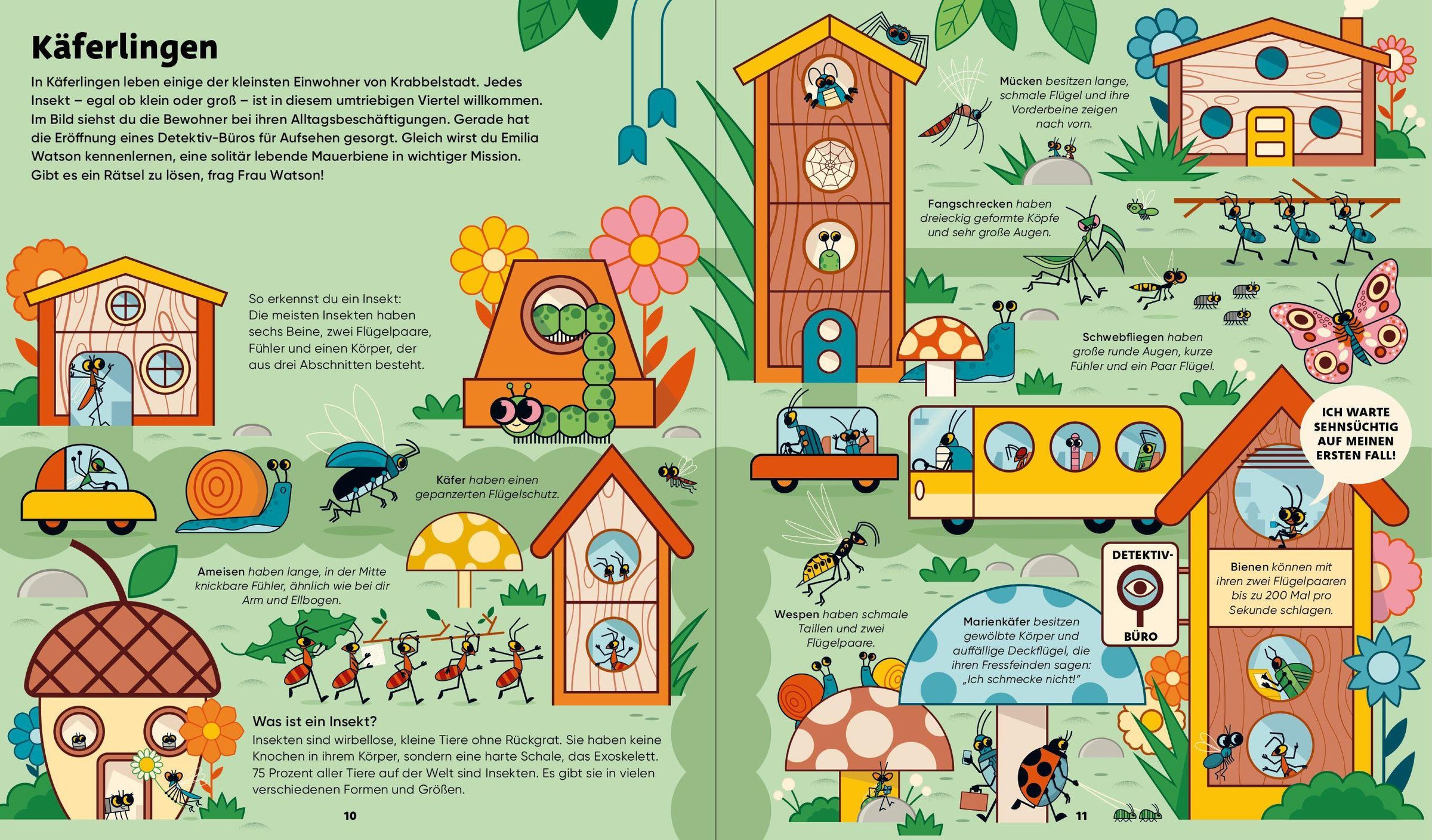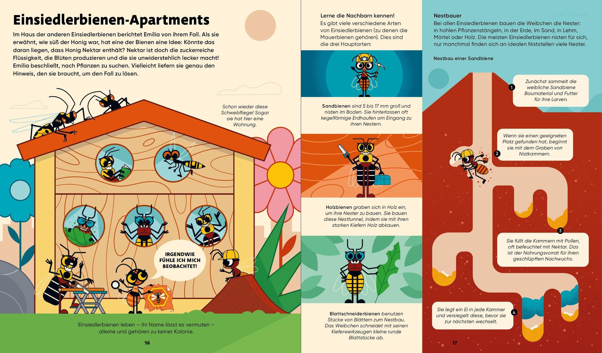 Die Mauerbiene Emilia Watson ist Inhaberin eines Detektiv-Büros. Ihre Recherchen führen sie durch ganz Krabbelstadt. Und während die kleinen Leser*innen sie bei ihren Ermittlungen begleiten, erfahren sie alles über die verschiedenen Bienenarten, wie sie leben, wie sie miteinander kommunizieren. Und was sie selbst tun können, um die Bienen zu unterstützen.