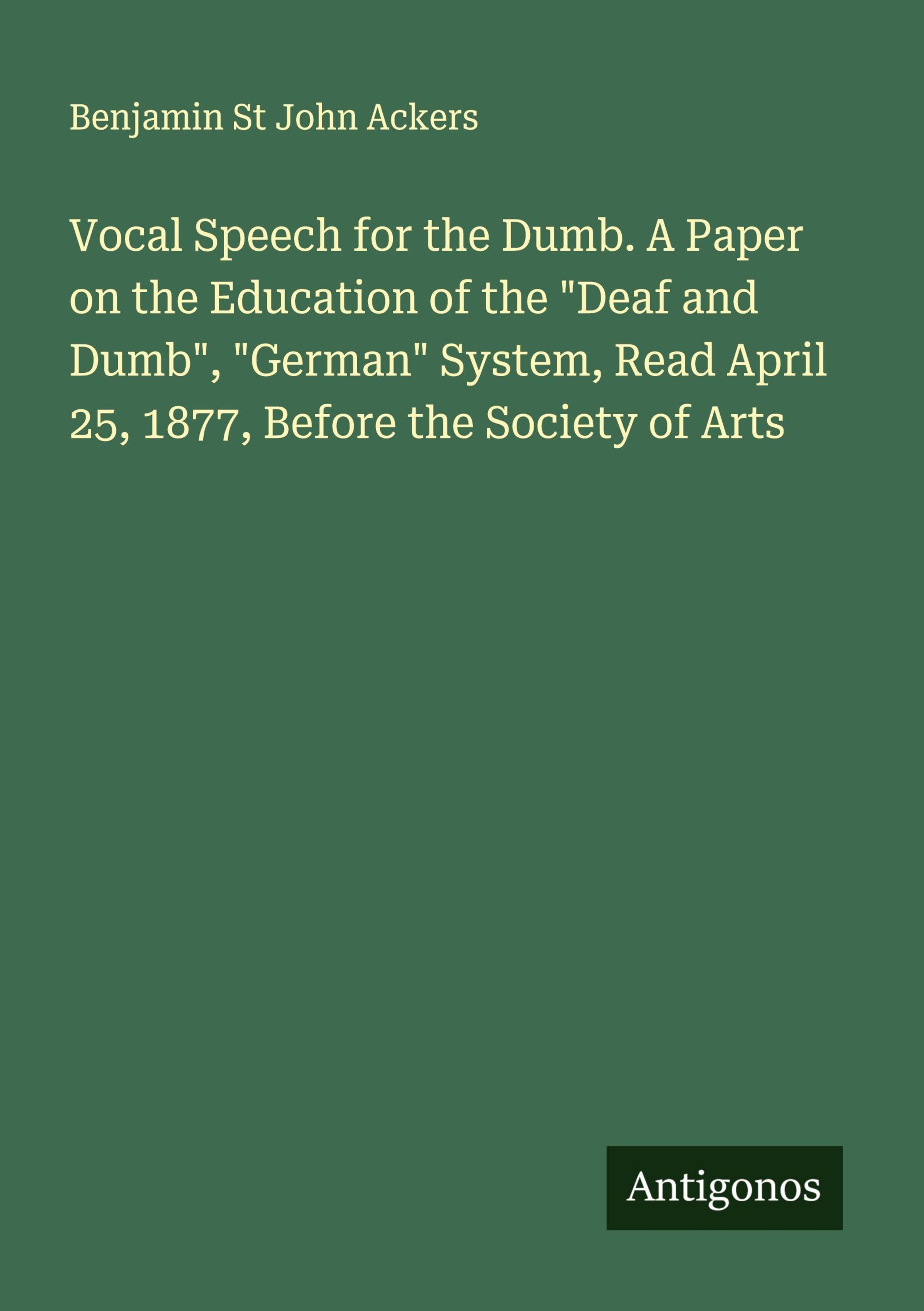 Vocal Speech for the Dumb. A Paper on the Education of the "Deaf and Dumb", "German" System, Read April 25, 1877, Before the Society of Arts