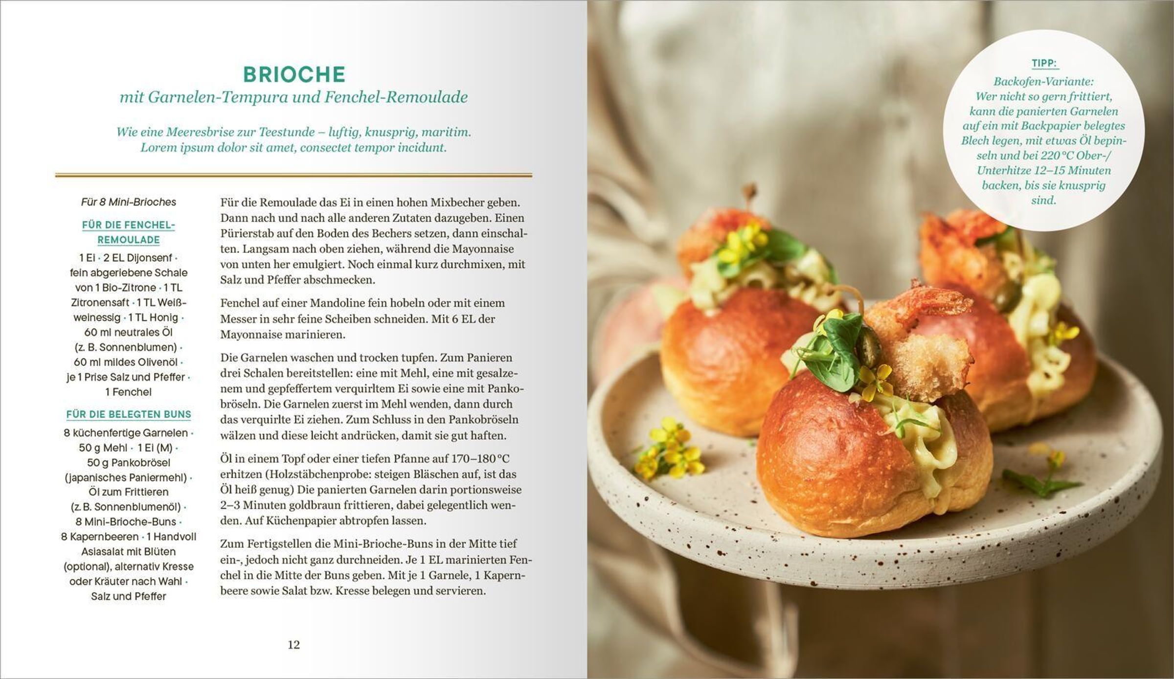 - **Kreative Vielfalt:**Von Mini-Brioche-Buns mit Flusskrebsen über Zitronen-Rosmarin-Scones bis hin zu Matcha-Panna-Cotta - moderne Rezepte für jeden Geschmack