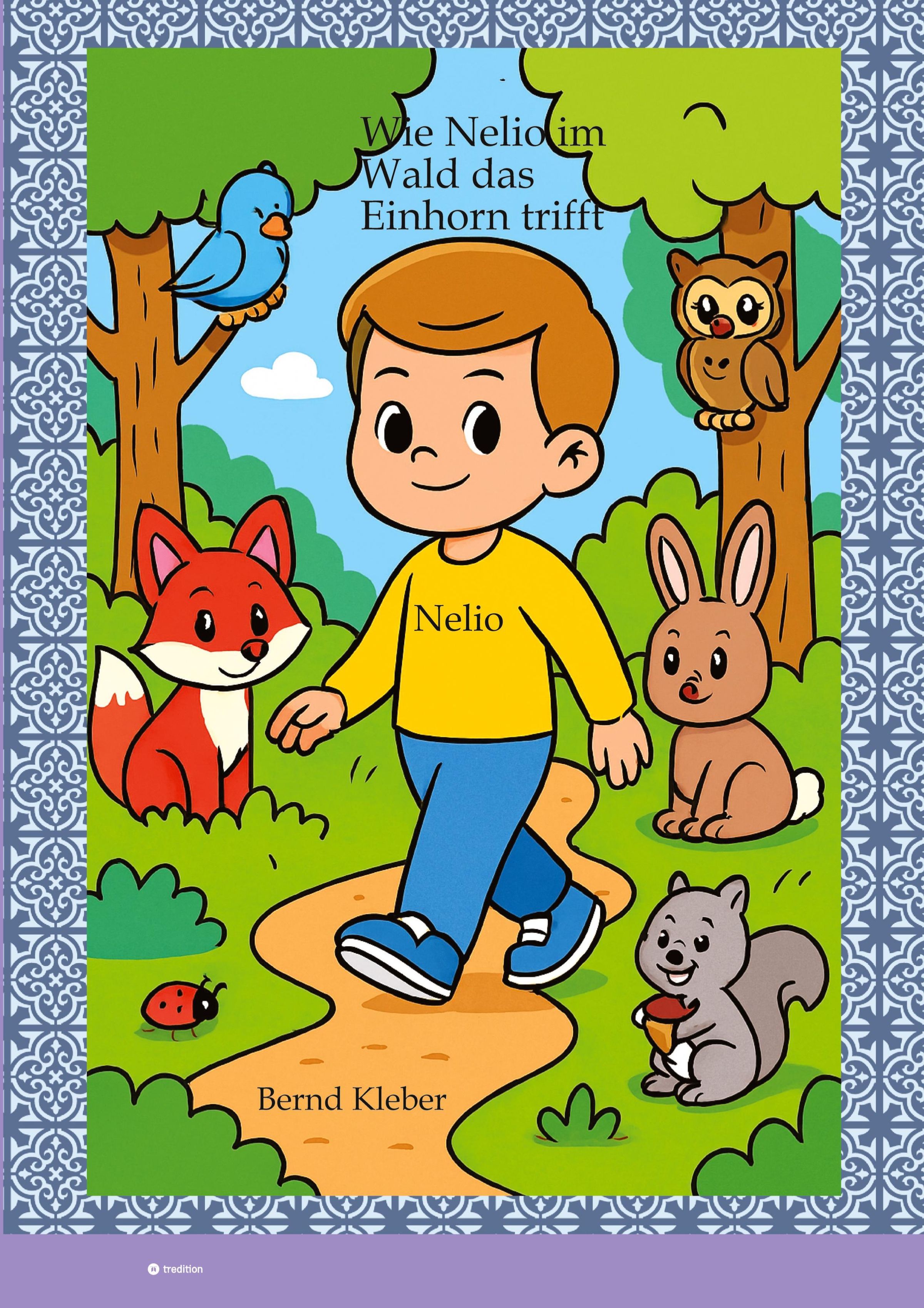 "Wie Nelio im Wald das Einhorn trifft" steht oben, darunter ein Junge namens Nelio mit Tieren in einem Wald., Buch