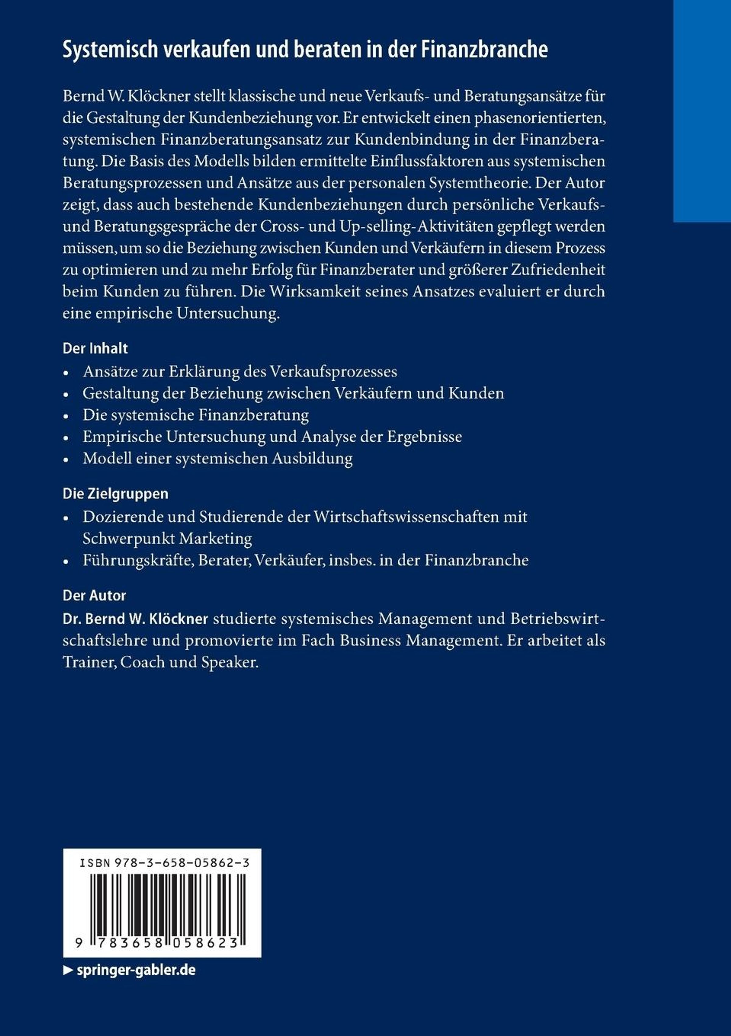 Bernd W. Klöckner stellt klassische und neue Verkaufs- und Beratungsansätze für die Gestaltung der Kundenbeziehung vor. Er entwickelt einen phasenorientierten, systemischen Finanzberatungsansatz zur Kundenbindung in der Finanzberatung. Die Basis des Modells bilden ermittelte Einflussfaktoren aus systemischen Beratungsprozessen und Ansätze aus der personalen Systemtheorie. Der Autor zeigt, dass auch bestehende Kundenbeziehungen durch persönliche Verkaufs- und Beratungsgespräche der Cross- und Up-selling-Aktivitäten gepflegt werden müssen, um so die Beziehung zwischen Kunden und Verkäufern in diesem Prozess zu optimieren und zu mehr Erfolg für Finanzberater und größerer Zufriedenheit beim Kunden zu führen. Die Wirksamkeit seines Ansatzes evaluiert er durch eine empirische Untersuchung.