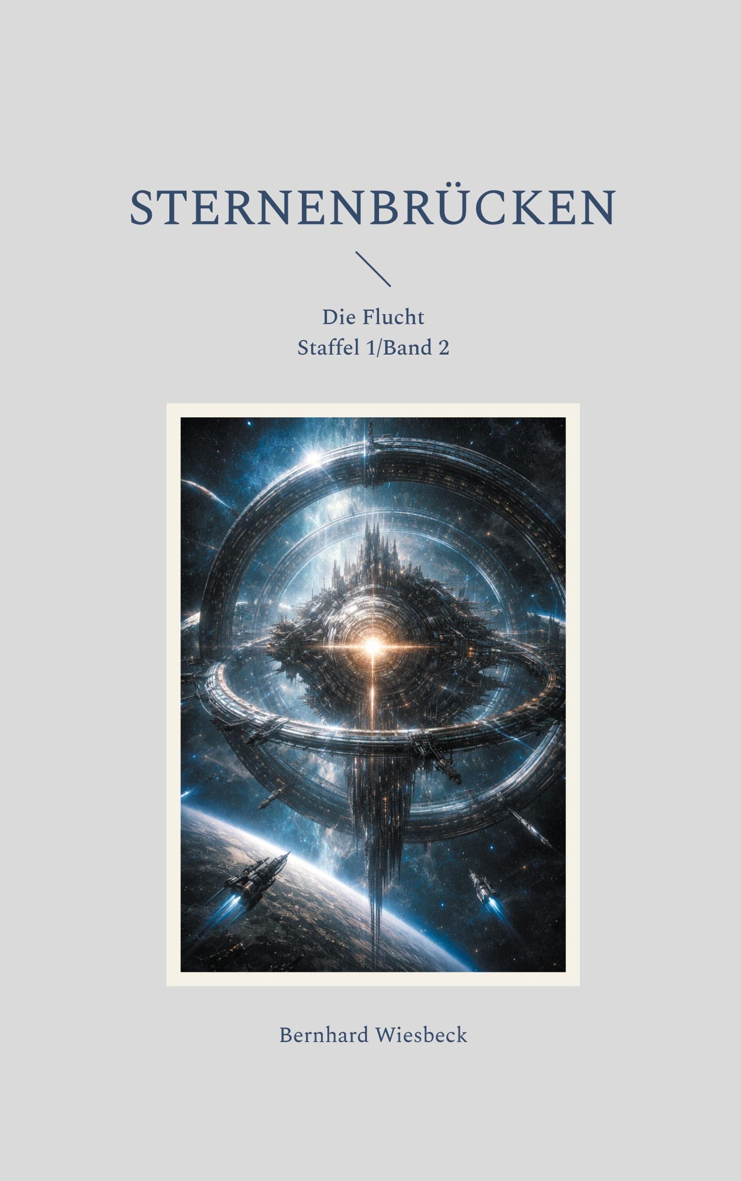 "Sternenbrücken: Die Flucht, Staffel 1/Band 2. Bernhard Wiesbeck." Illustration eines futuristischen Raumschiffs im Weltraum., Buch