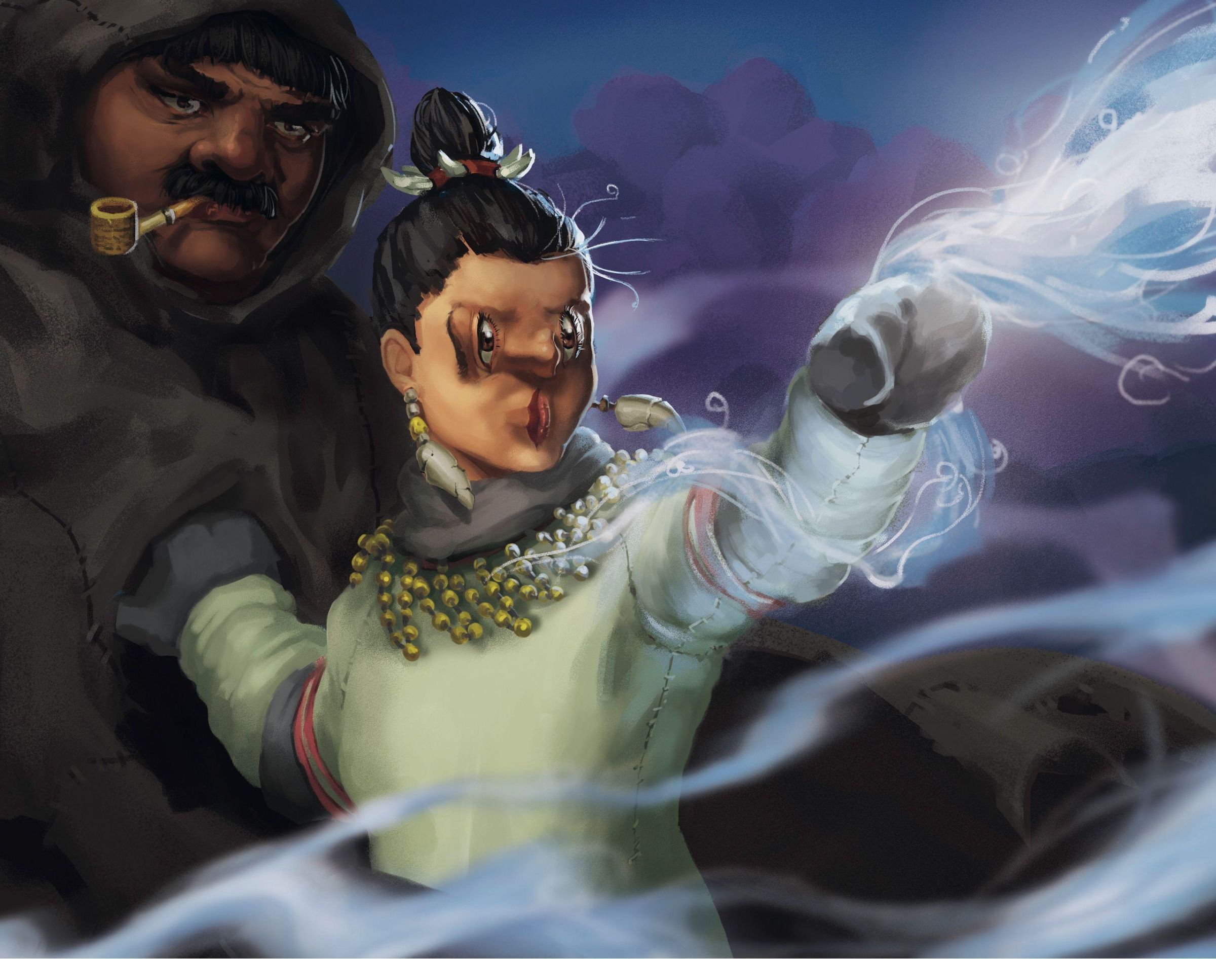 Über 60 Kreaturen werden in diesem reich illustrierten Kompendium beschrieben: von AAJUMAAQ , dem furchterregenden Hilfsgeist mit Hundeschädel, dessen lange schwarze Finger alles verwesen lassen, was sie berühren, bis UMIARISSAT , den gefährlichen Bootsleuten, die sich in Robben verwandeln. Die Geschichten von ANGAKKUT , den Schamanen, die in Trance zwischen den Welten reisen, enthüllen eine komplexe spirituelle Dimension. SASSUMA ARNAA wacht über die Meerestiere, ANINGAAQ lenkt vom Mond aus die Geschicke der Menschen, und der AMAROQ , ein Riesenwolf, durchstreift die Wollgrasebenen am Eisschild.