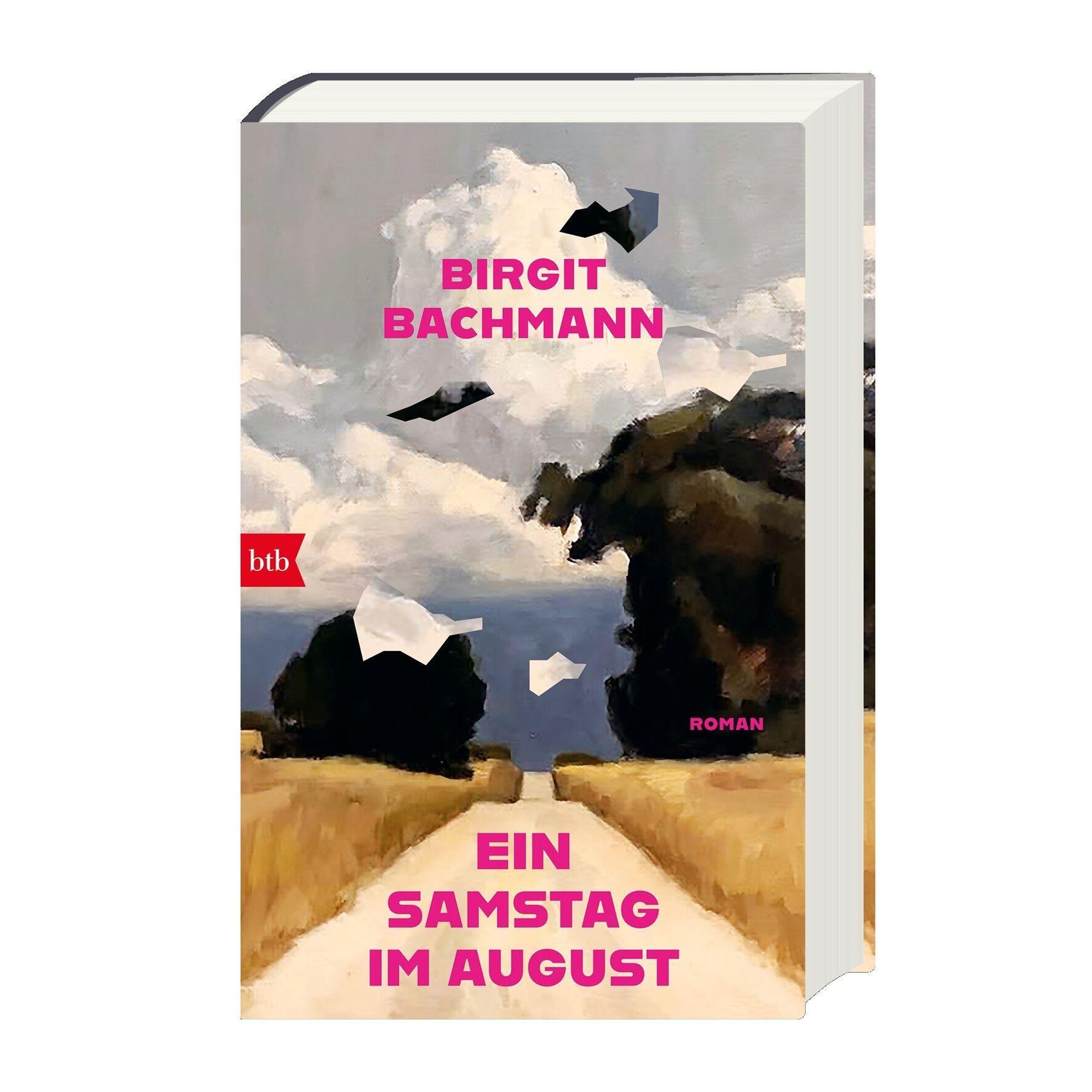 Text in kräftigem Pink: „Birgit Bachmann, EIN SAMSTAG IM AUGUST, ROMAN“. Eine Landschaft mit Feldern unter Wolken., Buch
