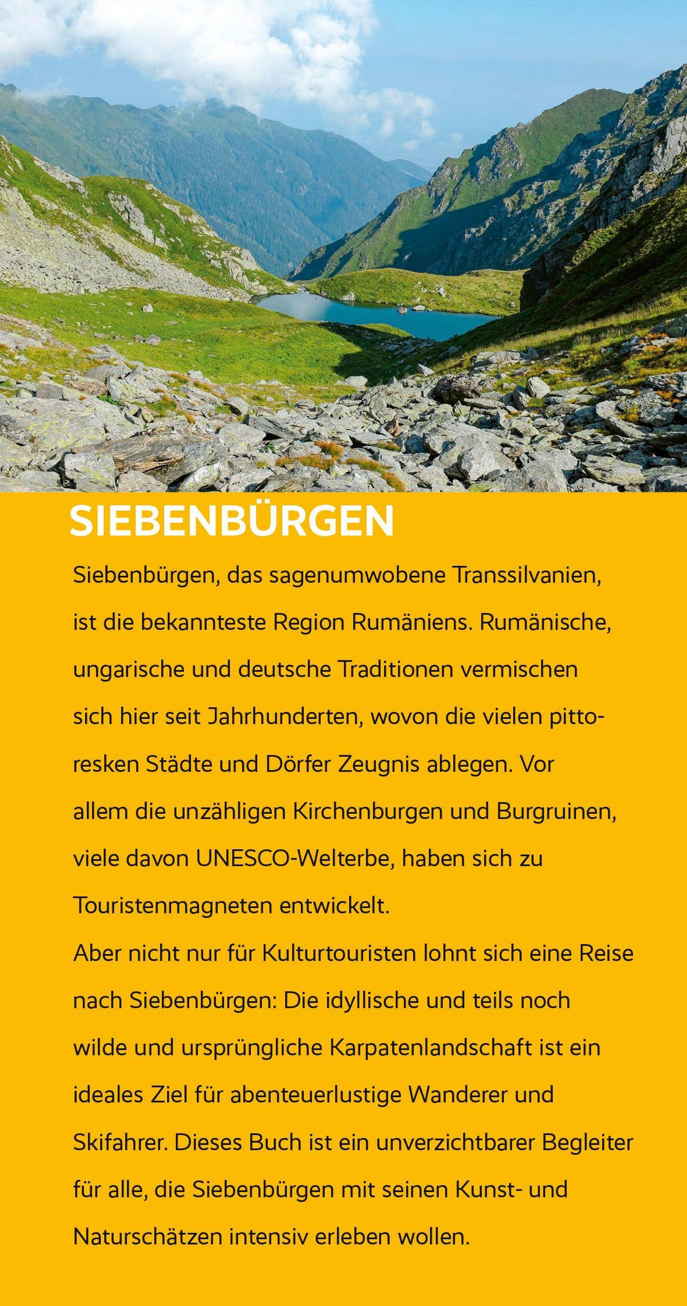 "Siweberjen" nennen die Siebenbürger Sachsen ihre Heimat am Karpatenbogen - ein ideales Urlaubsziel für Natur- und Kulturbegeisterte, Abenteuerlustige, Wanderer. Hier dehnen sich die letzten riesigen Urwälder Europas aus, viele davon in National- und Naturparks geschützt. In den Städten haben vor allem die Siebenbürger Sachsen ihre Spuren hinterlassen. Die heimliche Hauptstadt Bräov (Kronstadt) besticht mit ihrer malerischen Altstadt. Sighi¿oaras (Schäßburg) mittelalterliche Burganlage zählt zum UNESCO-Welterbe. Das historische Zentrum von Sibiu (Hermannstadt) erstrahlt ebenfalls wieder in altem Glanz, während in der Studentenstadt Cluj-Napoca (Klausenburg) buntes Nachtleben herrscht.