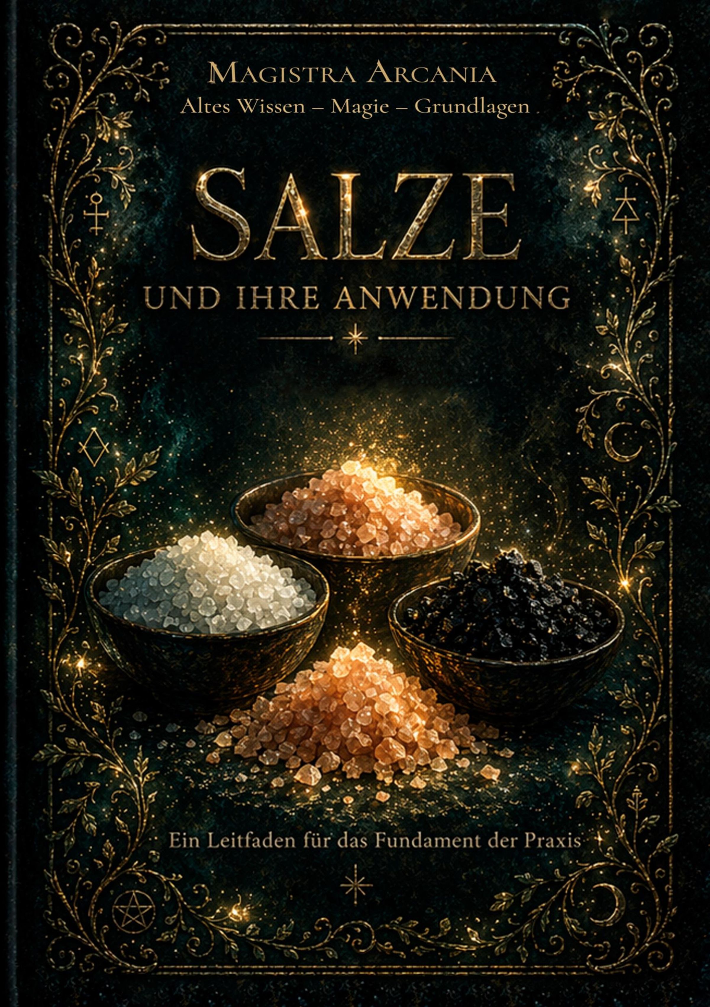 „Magistra Arcania: Altes Wissen – Magie – Grundlagen. Salze und ihre Anwendung.“ Drei Schalen mit verschiedenen Salzen., Buch