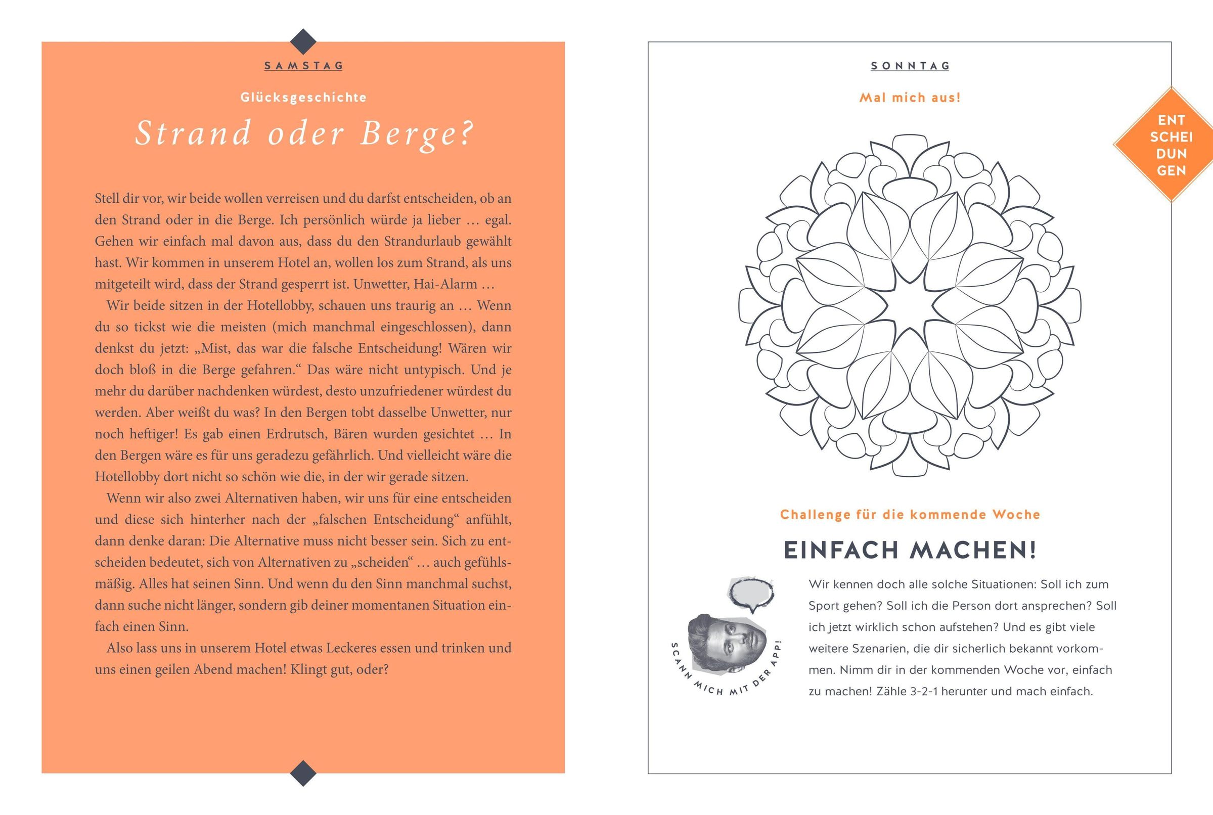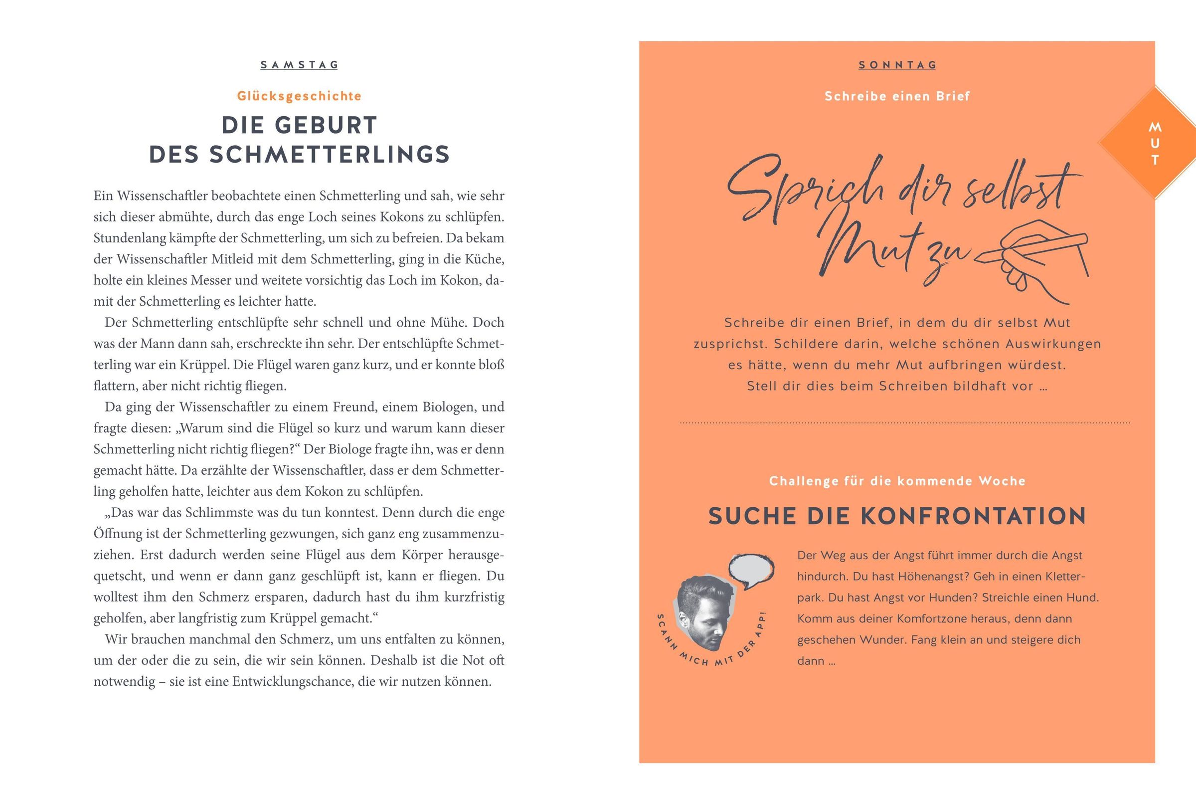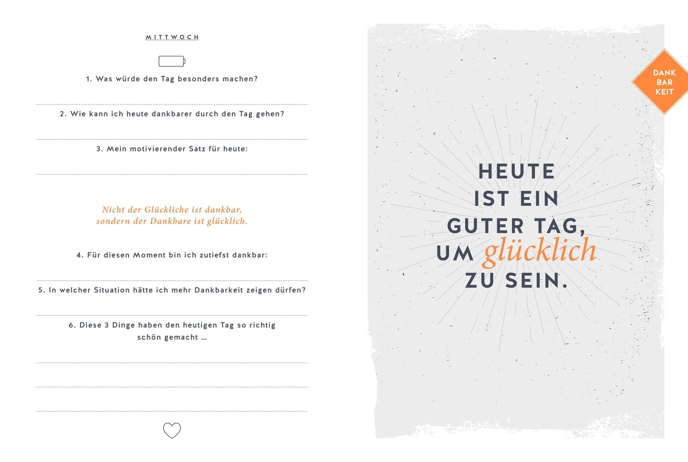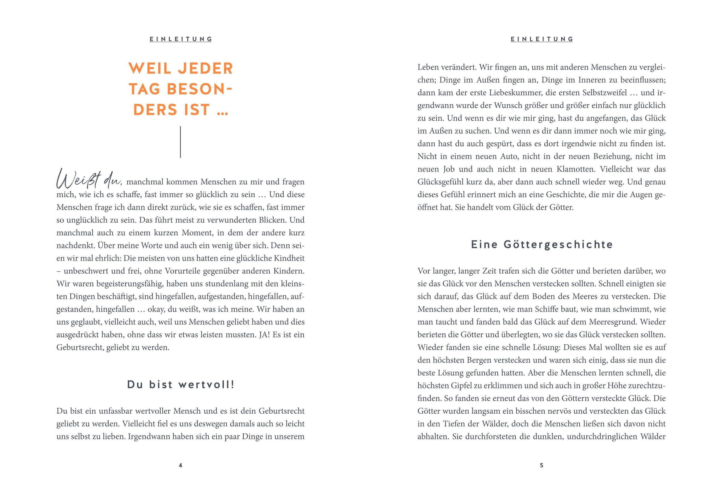 Dieses Tagebuch verändert Leben. Wer es zu seinem besten Freund macht, wird erleben, dass er Tag für Tag etwas glücklicher wird. Warum? Weil jeder Tag besonders ist! Mit seiner wunderbaren Mischung aus Leichtigkeit und Tiefgang geleitet Biyon den Leser durch die Tage und Wochen und zeigt, wie viel Spaß der Alltag bereithält. Morgens und abends beantwortet der Tagebuchschreiber inspirierende Fragen; das kostet jeweils nicht mehr als zwei Minuten. Er bewältigt kleine überraschende Aufgaben und eignet sich neue, heilsame Routinen an. Durch inspirierende Geschichten, Challenges und wöchentliche Videos, die mit der GU Mind&Soul App abgerufen werden können, eröffnet Biyon neue positive Seiten im Leben. Zudem ist jeder Monat einem wichtigen Thema gewidmet, etwa Dankbarkeit oder Selbstliebe. Biyons positive Energie steckt an: Schluss mit negativen Gedanken und hinderlichen Gewohnheiten! Mit diesem Tagebuch ist Biyon immer voller Motivation und guter Laune an deiner Seite.