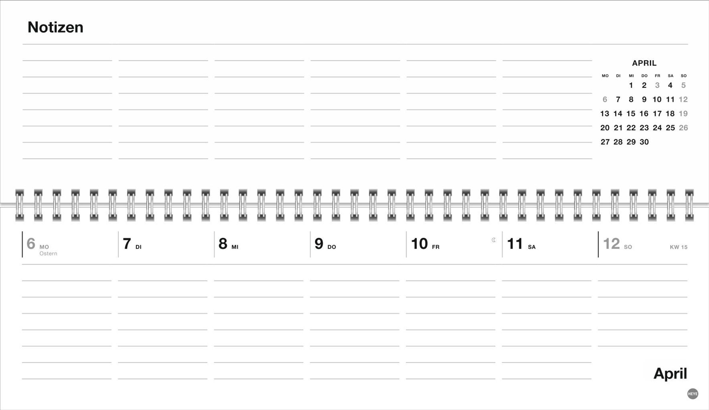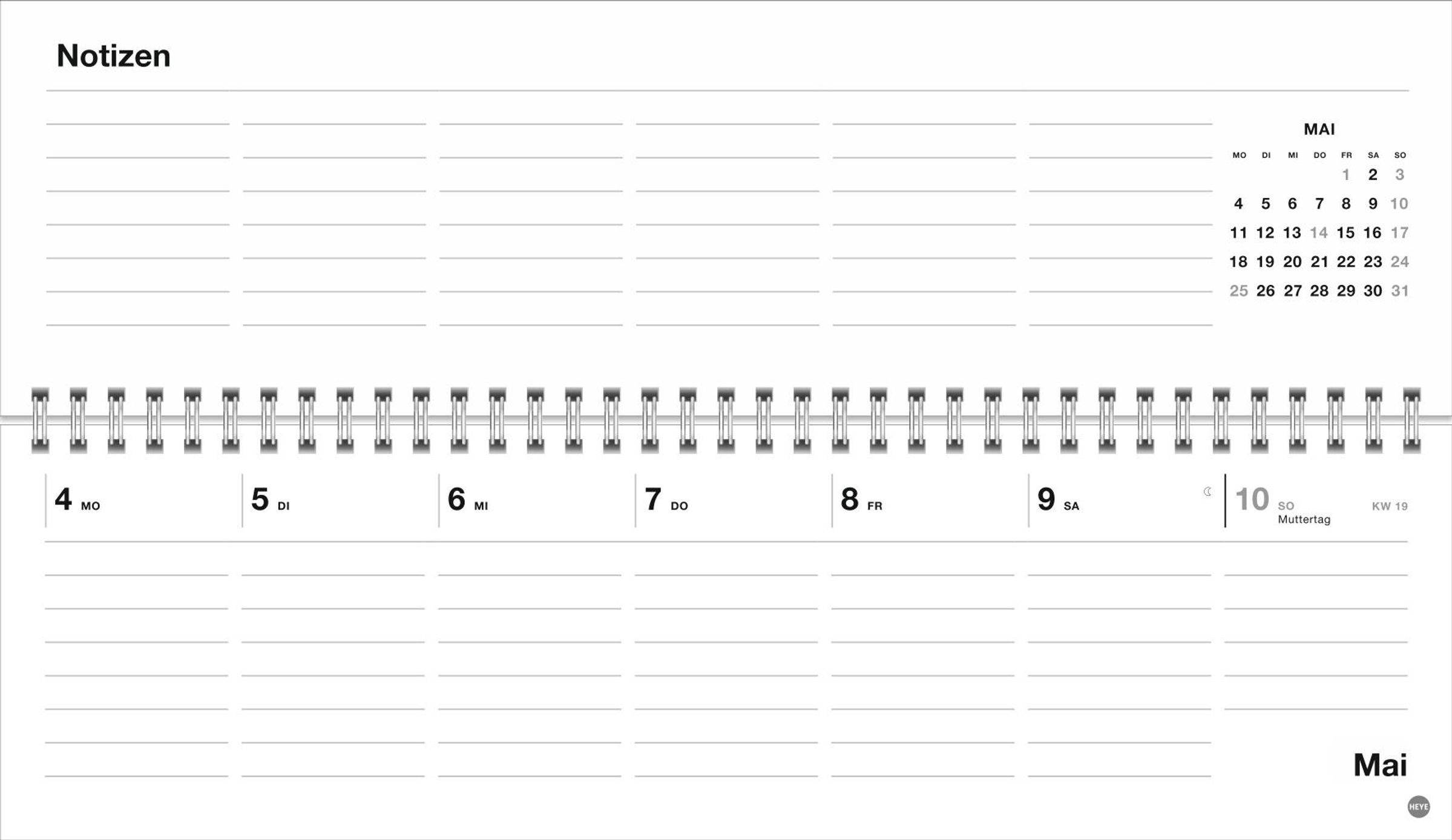 Schreibtisch-Kalender im Querformat im zeitlosen Minimalist Design: Eine Woche auf einer Doppelseite, inklusive Monatskalendarium