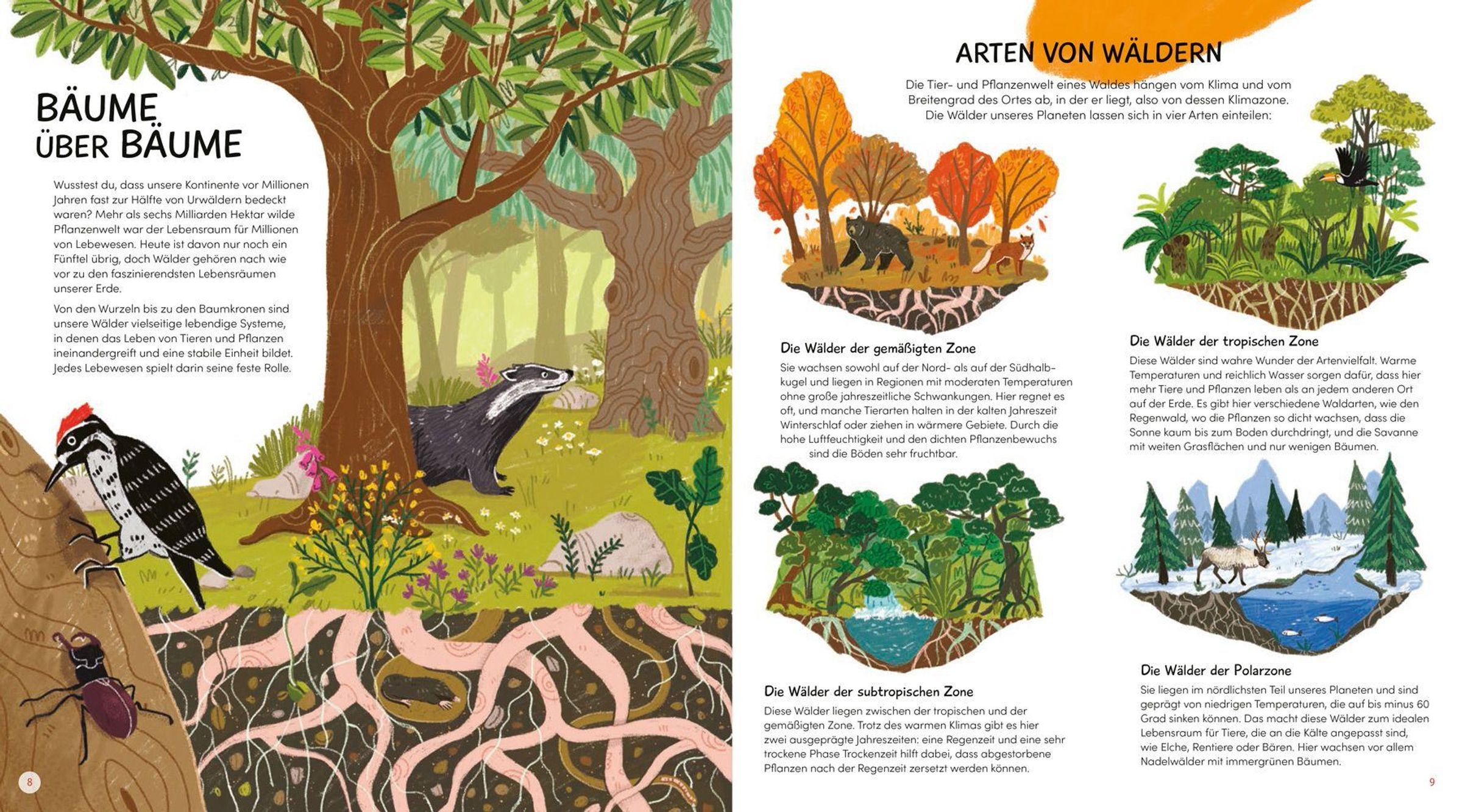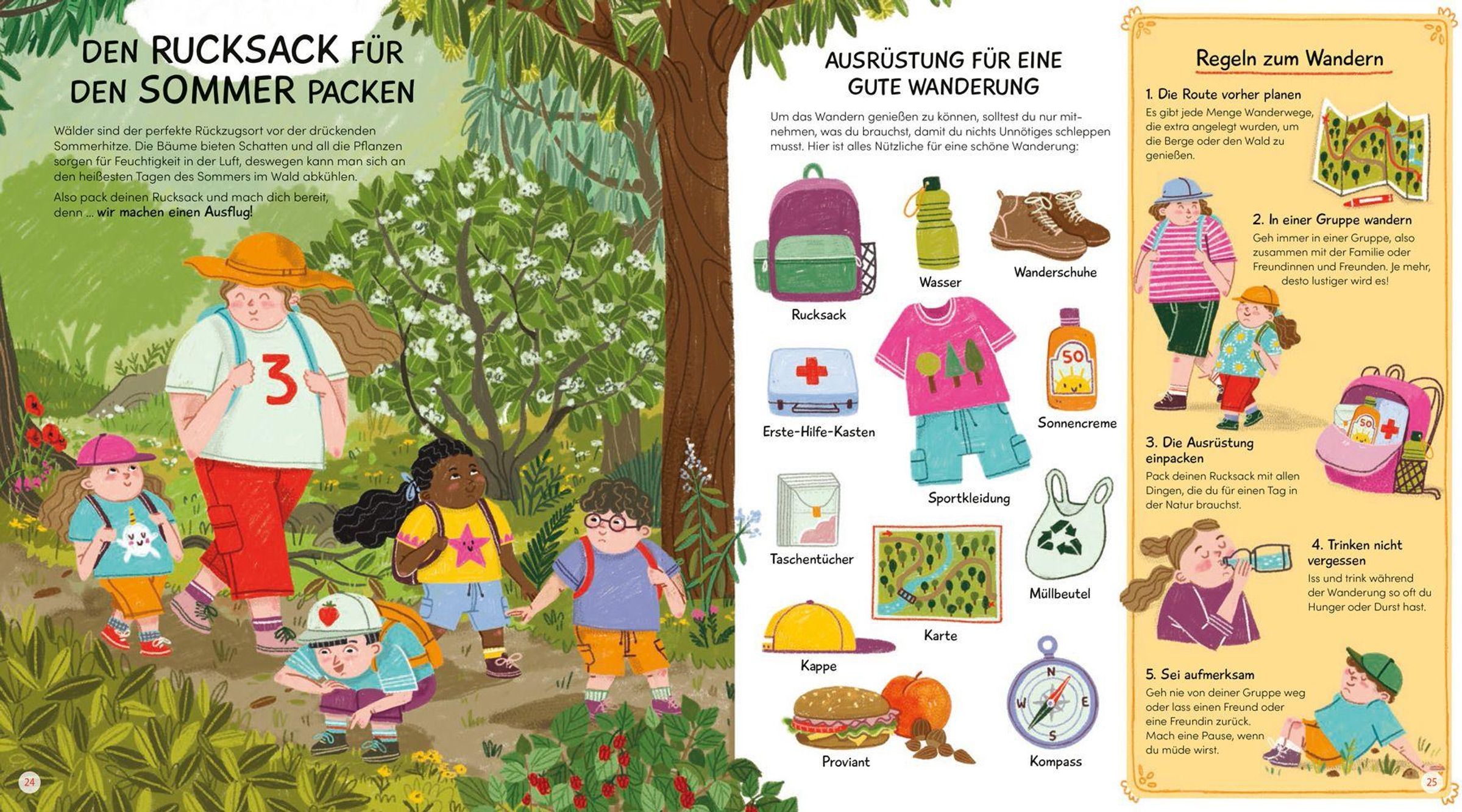 Die Wälder und Berge unserer Erde sind magische Orte und Heimat vieler Lebewesen und Pflanzen . Von riesigen Bären und Hirschen über die kleinsten Insekten bis zu Bäumen, Sträuchern und Pilzen gibt es unendlich viel zu entdecken! Hast du schon mal eine Kastanie gepflanzt ? Weißt du, welche Tiere Winterschlaf halten oder wie man aus einem Milchkarton ein Vogelhaus baut ? Und was gehört in den Rucksack für einen gelungenen Ausflug? Dieses liebevoll bunt illustrierte Buch ist voller kindgerechter Informationen rund um die Tier- und Pflanzenwelt. Abenteuerlust garantiert!