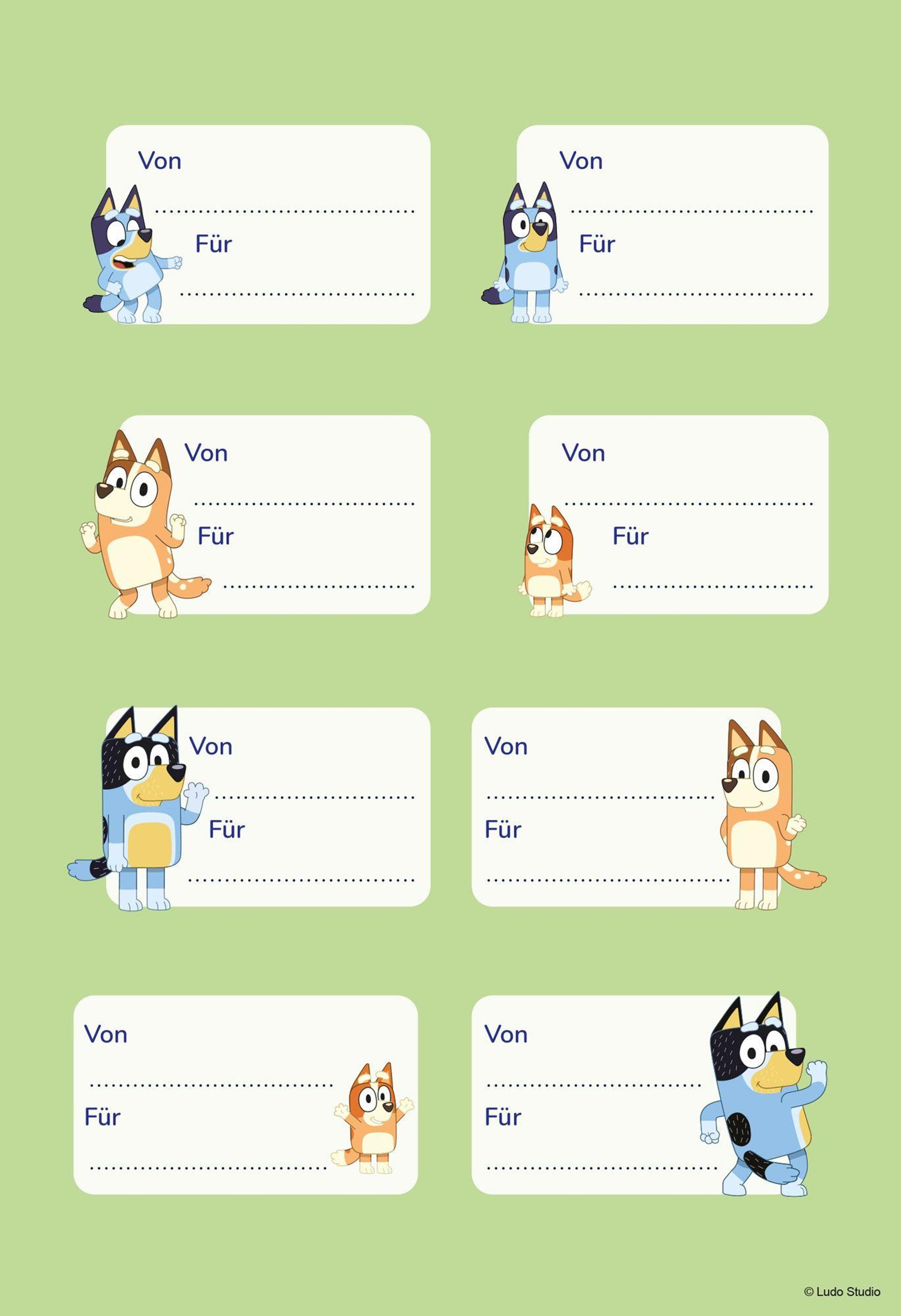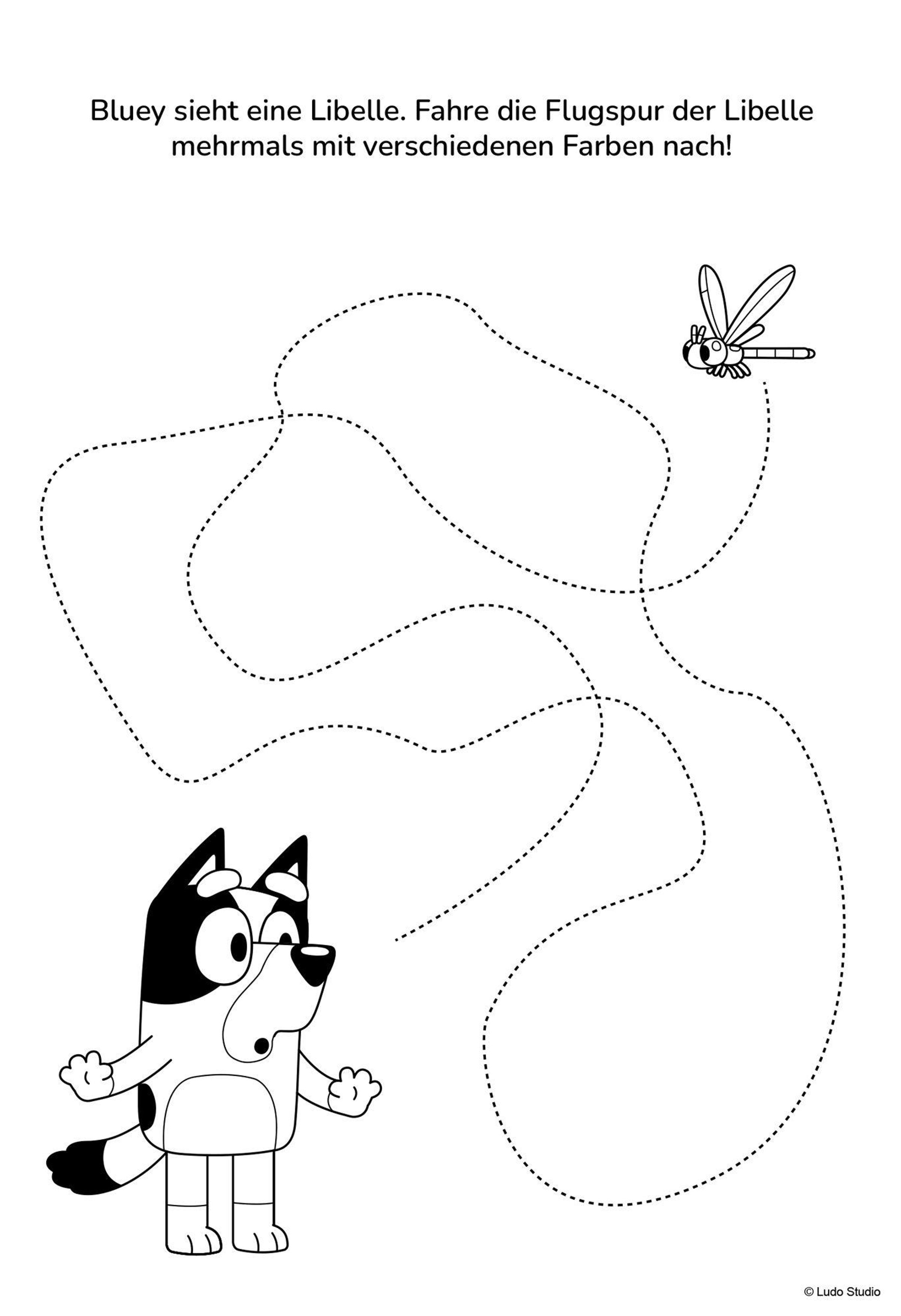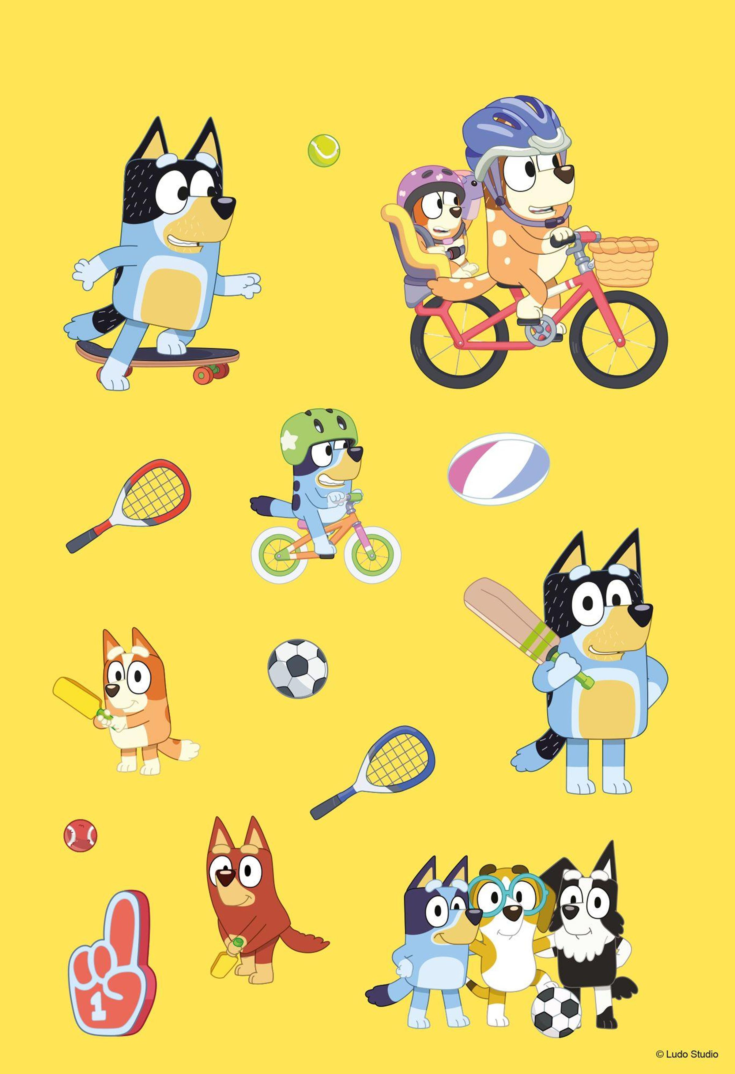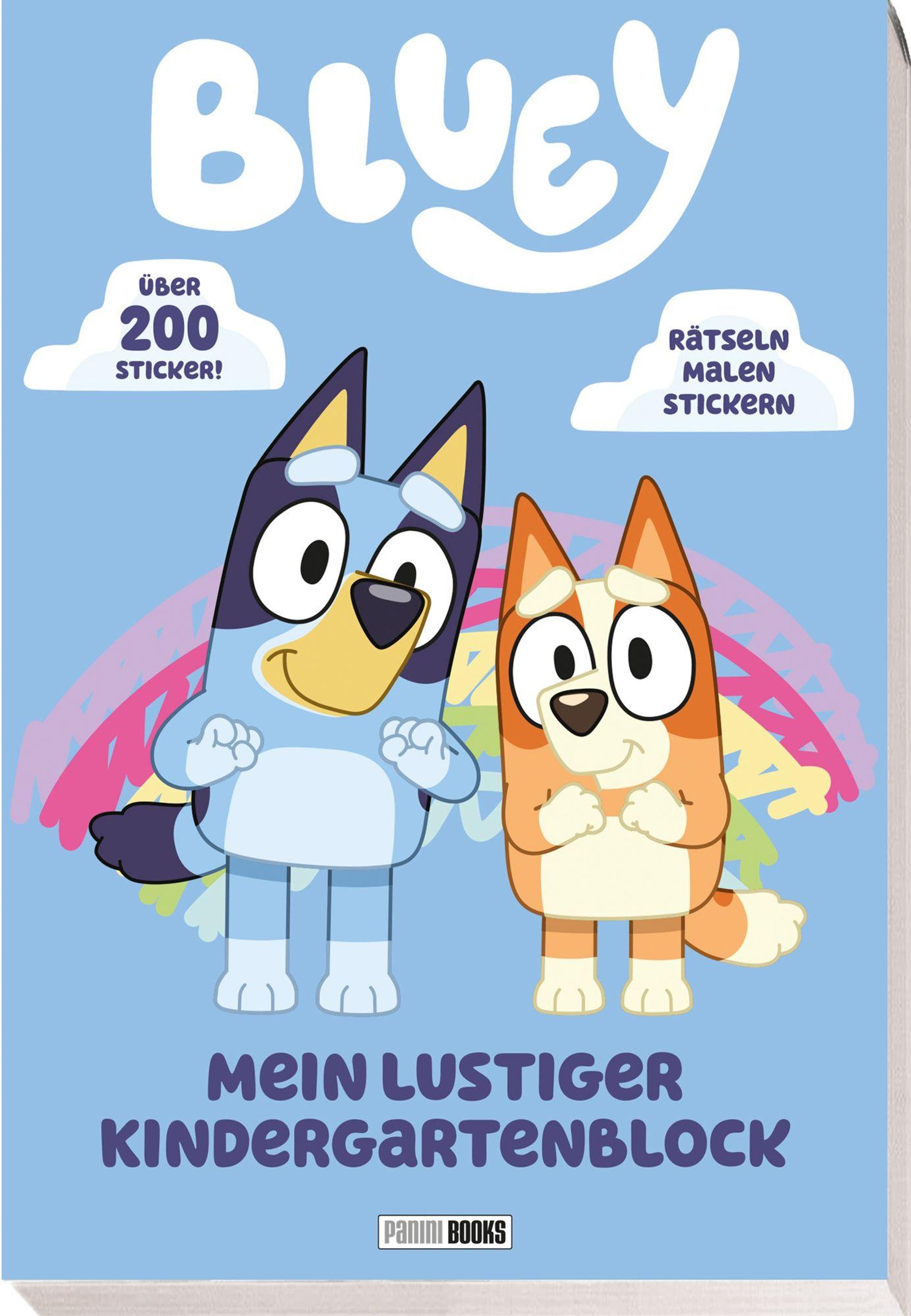 Begleite Bluey in ihre lustige Welt! Jede Menge Sticker, Rätsel und Ausmalbilder warten auf dich!