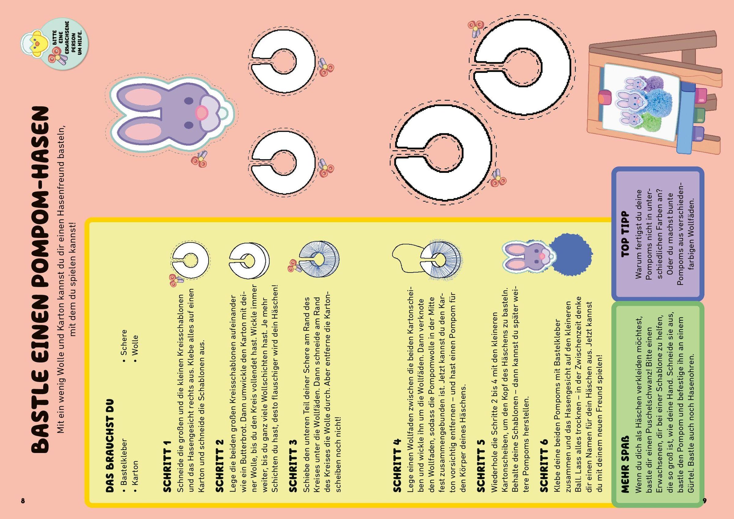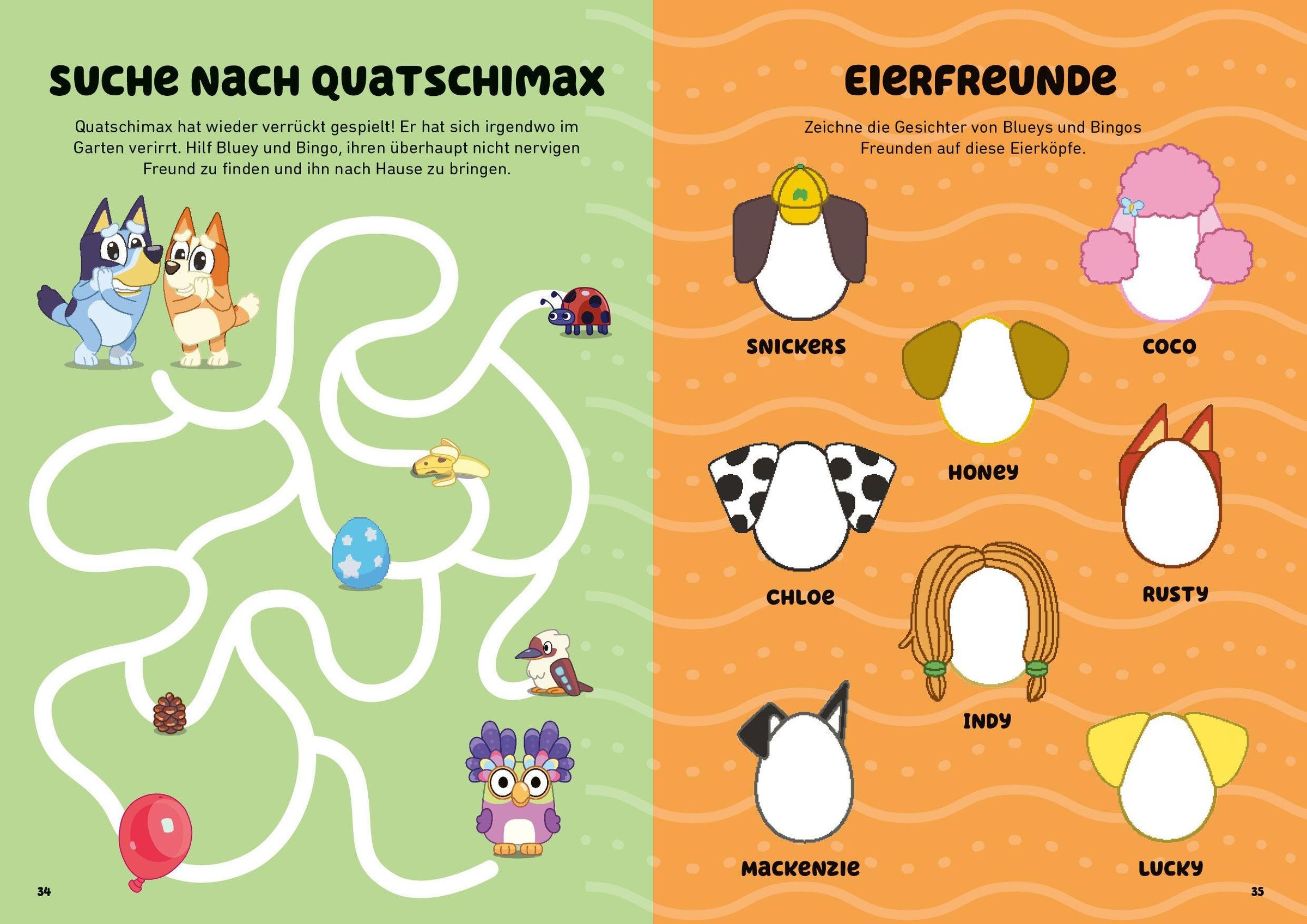 Der Osterspaß-Sammelband enthält die Bluey-Oster-Activity-Heft 'Osterspaß!' und 'Neuer Osterspaß' mit vielen Beschäftigungstipps für alle Fans der Animationsserie BLUEY.