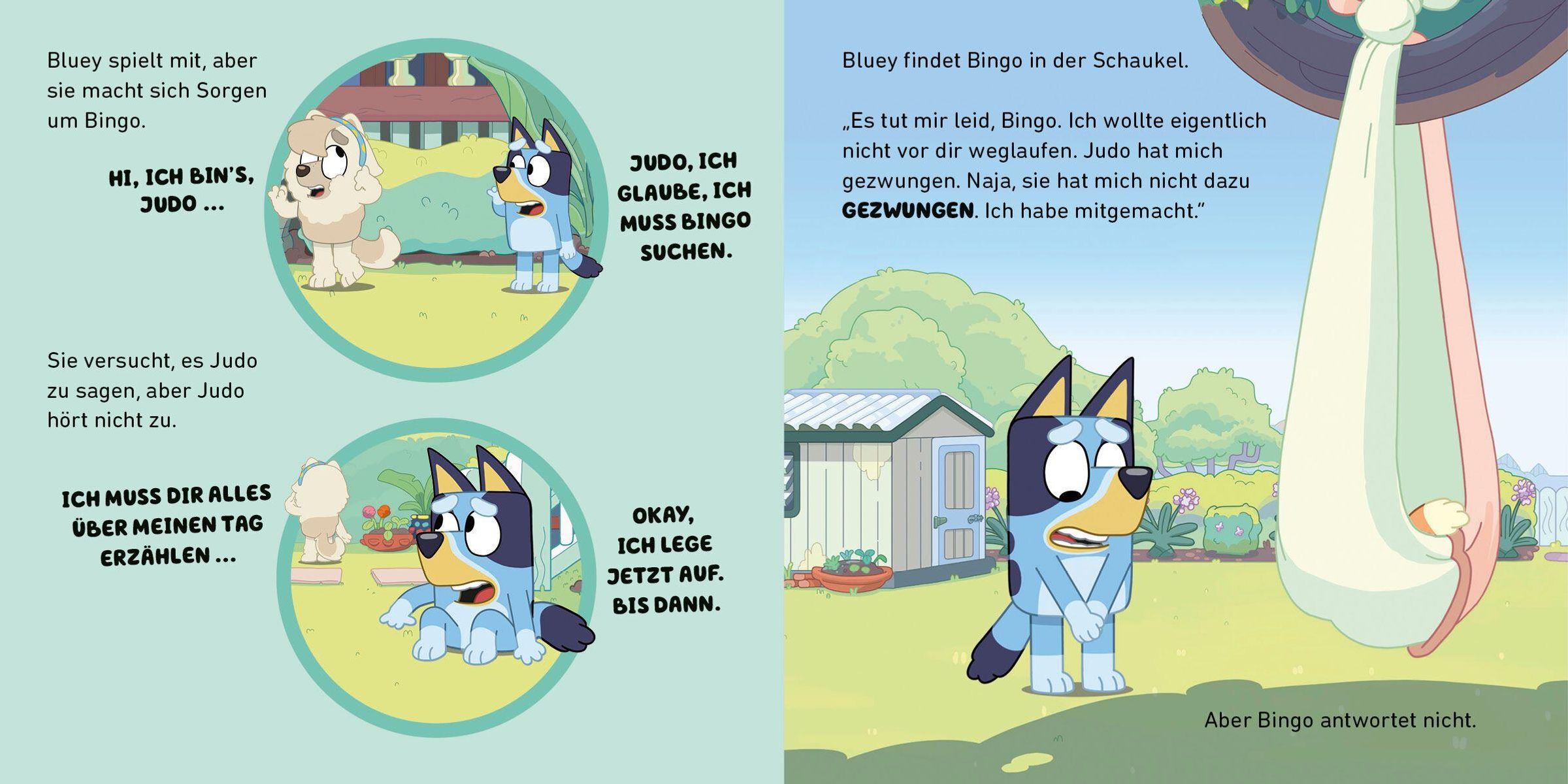 Text: BLUEY, SCHMETTERLINGE. Illustration: Zwei fröhliche Hundewelpen, einer in einer Hängematte, draußen im Garten., Buch