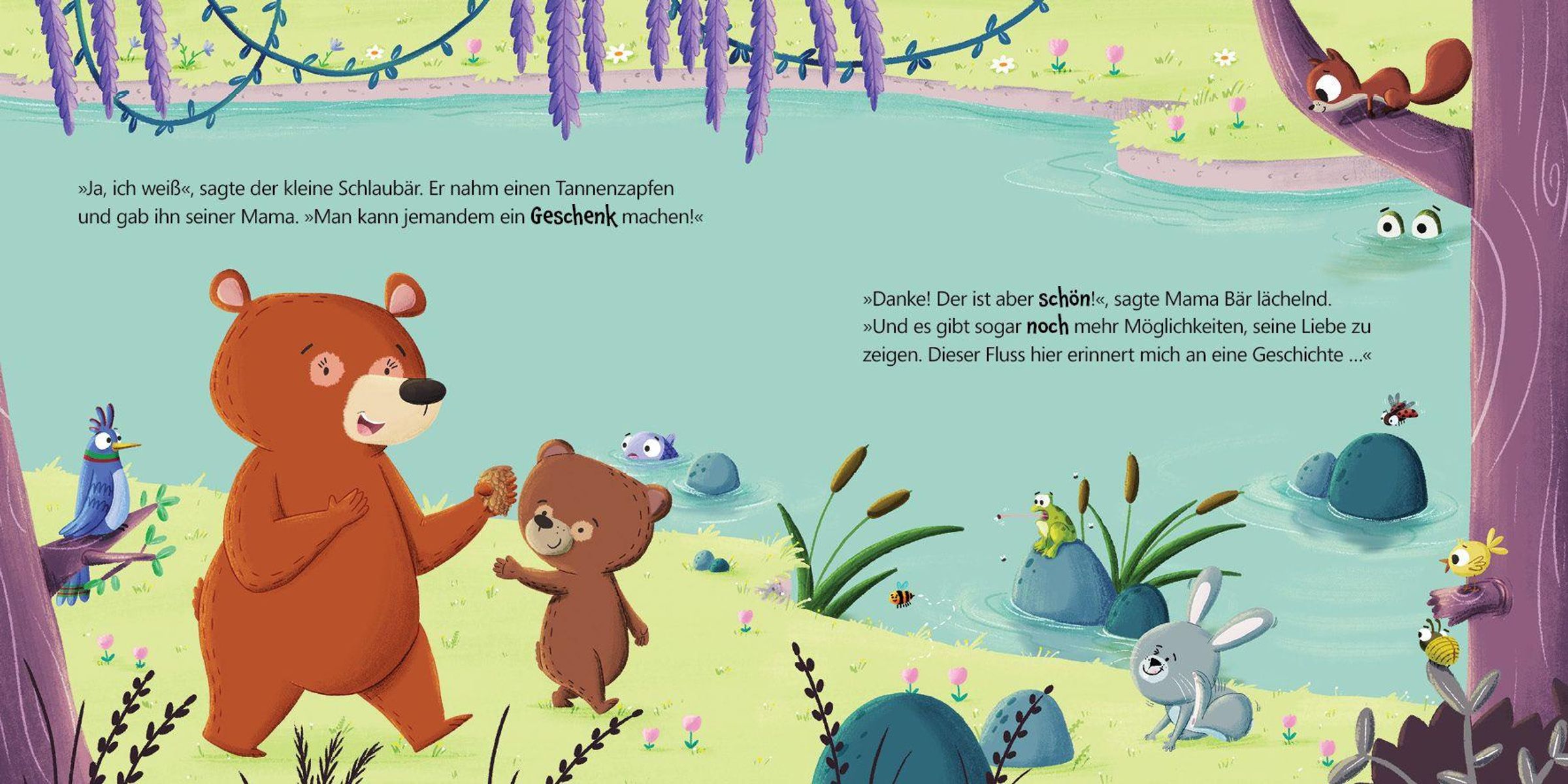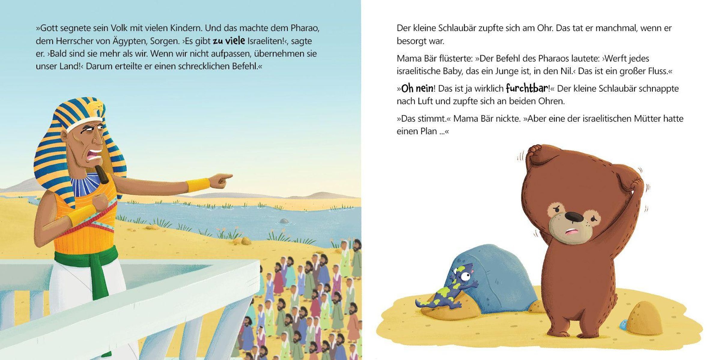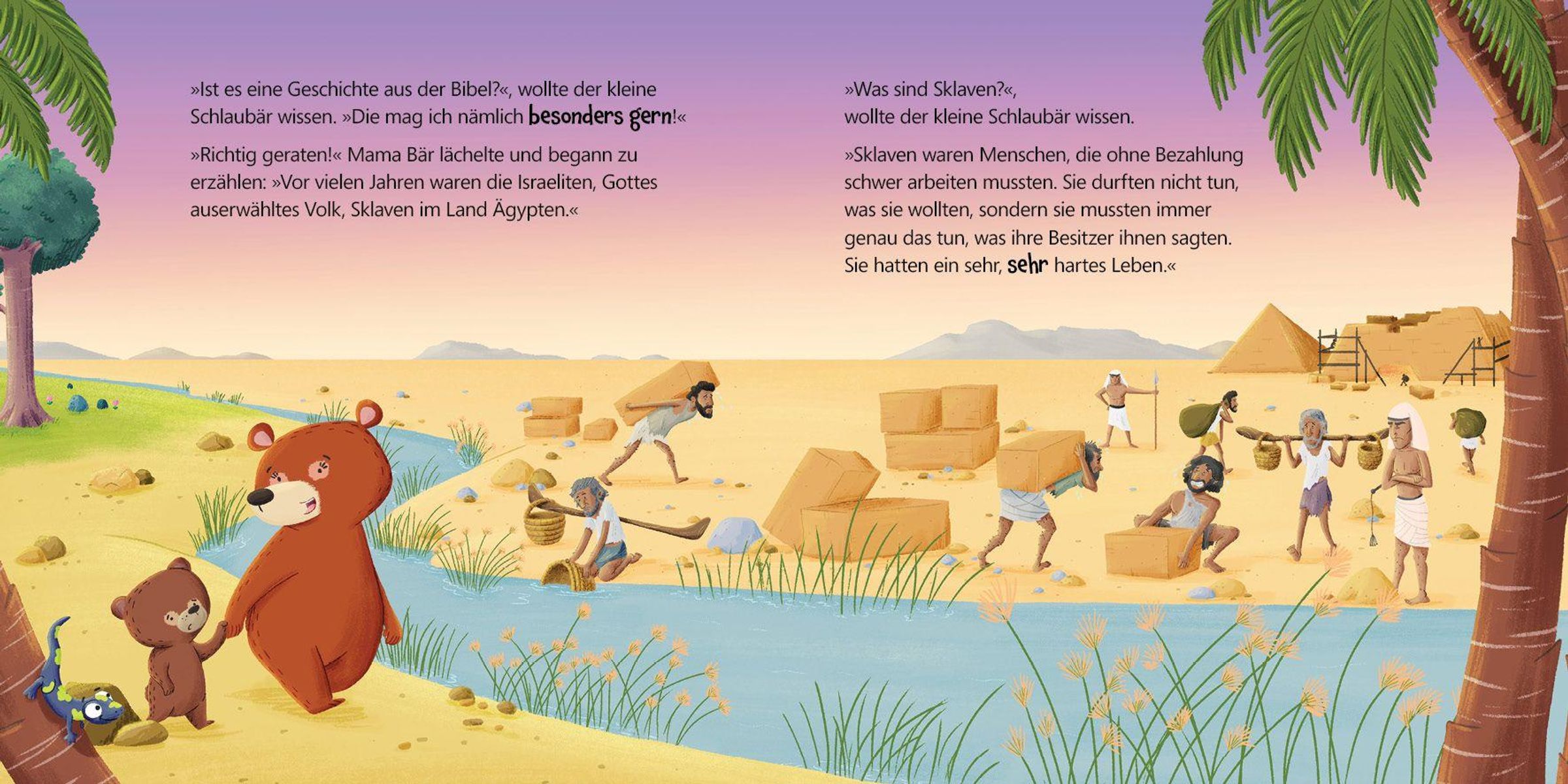 'Ich hab dich lieb, Mama!', sagt der kleine Schlaubär. 'Ich hab dich auch lieb', sagt Mama Bär und drückt den kleinen Schlaubären fest an sich. Dann erzählt sie ihm die wunderbare Geschichte von Mose: einem kleinen Baby, das ein großes Abenteuer erlebte. Sie erzählt von einer mutigen Mama, die ihr Kind so sehr liebte, dass sie es in einem Körbchen auf den Nil setzte, von einer tapferen großen Schwester, die gut auf ihren kleinen Bruder aufpasste, und von einer freundlichen Prinzessin mit einem riesengroßen Herzen ...