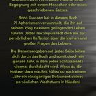 Bodo Janssen gibt mit diesem Buch unserem Denken eine Richtung. 91 illustrierte Aphorismen mit je einem Textimpuls laden ein zur persönlichen Reflexion über die kleinen und großen Fragen des Lebens. Die Datumsangaben auf jeder Seite leiten die Leser*innen durch das Buch und somit durch ein ganzes Jahr, denn jeder Schlüsselsatz wird vier Mal durchdacht. Wer sich jedes Mal Notizen macht, wird nach dem Verlauf eines Jahres ein einzigartiges Dokument seines persönlichen Wachstums erstellt haben. Und wer möchte, beginnt einfach wieder von vorn!