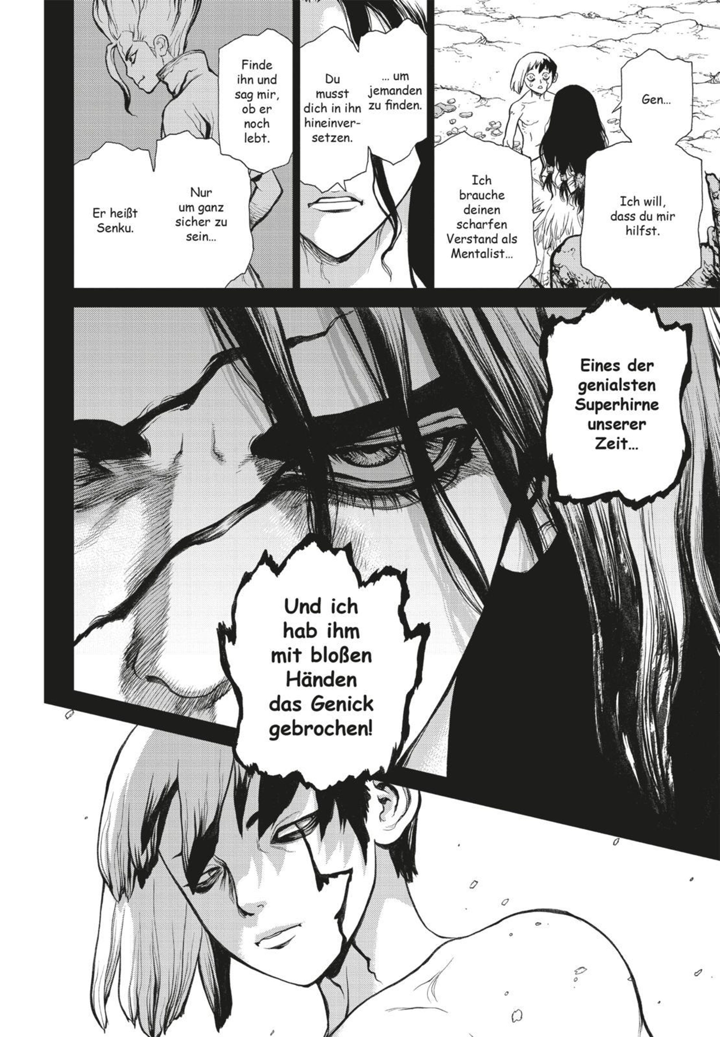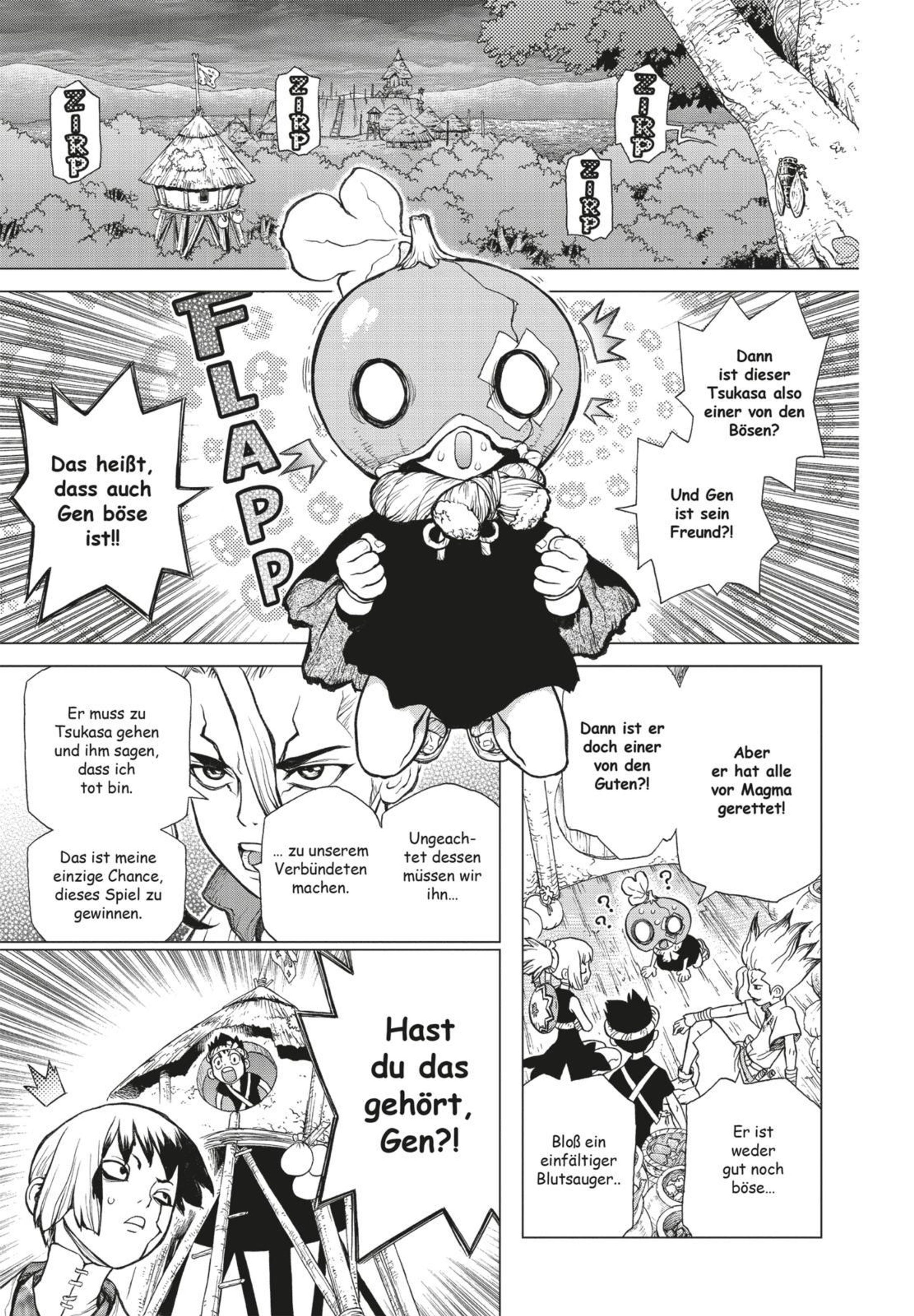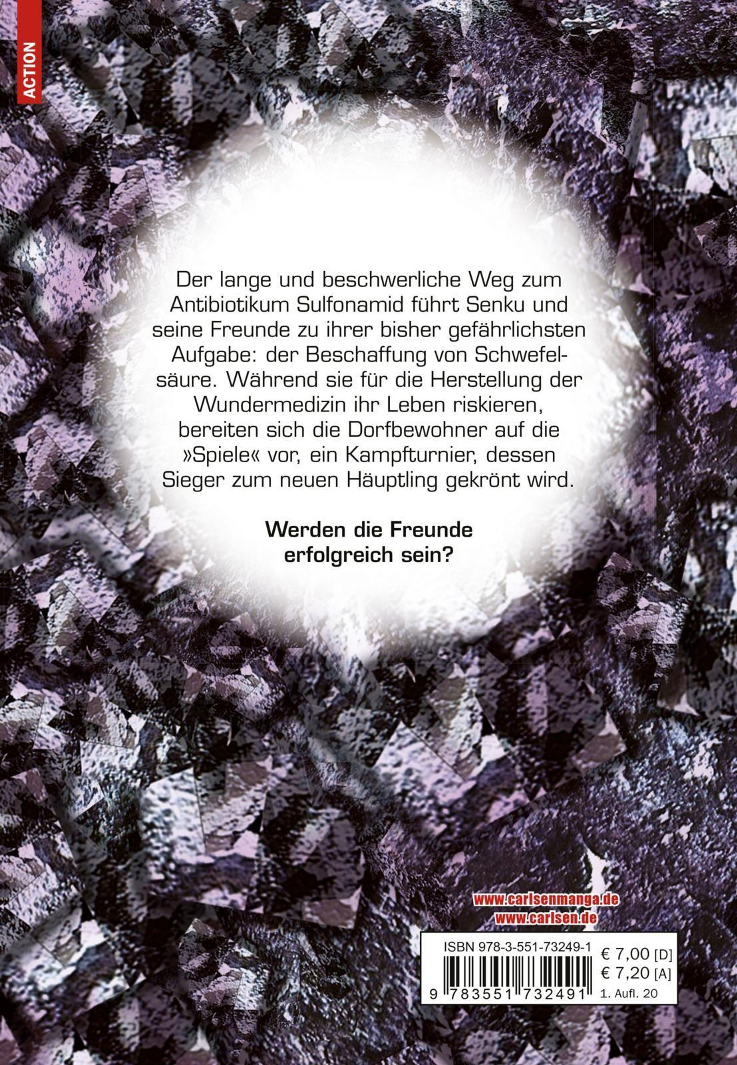 Der lange und beschwerliche Weg zum Antibiotikum Sulfonamid führt Senku und seine Freunde zu ihrer bisher gefährlichsten Aufgabe: der Beschaffung von Schwefelsäure. Während sie für die Herstellung der Wundermedizin ihr Leben riskieren, bereiten sich die Dorfbewohner auf die >>Spiele<< vor, ein Kampfturnier, dessen Sieger zum neuen Häuptling gekrönt wird.