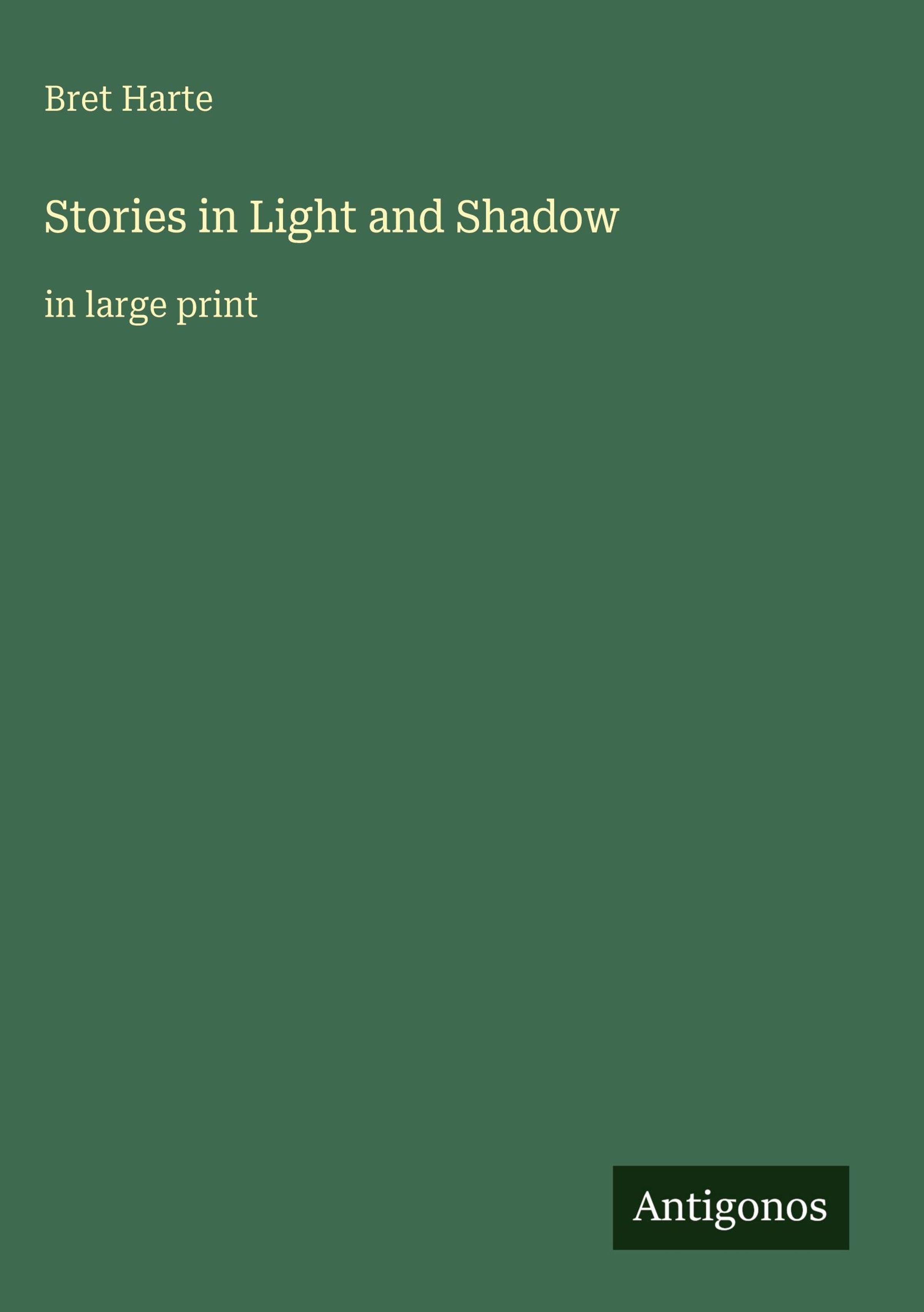 Links steht der Text: "Bret Harte, Stories in Light and Shadow, in large print." Unten rechts kleines Logo: "Antigonos". Grüner Hintergrund., Buch