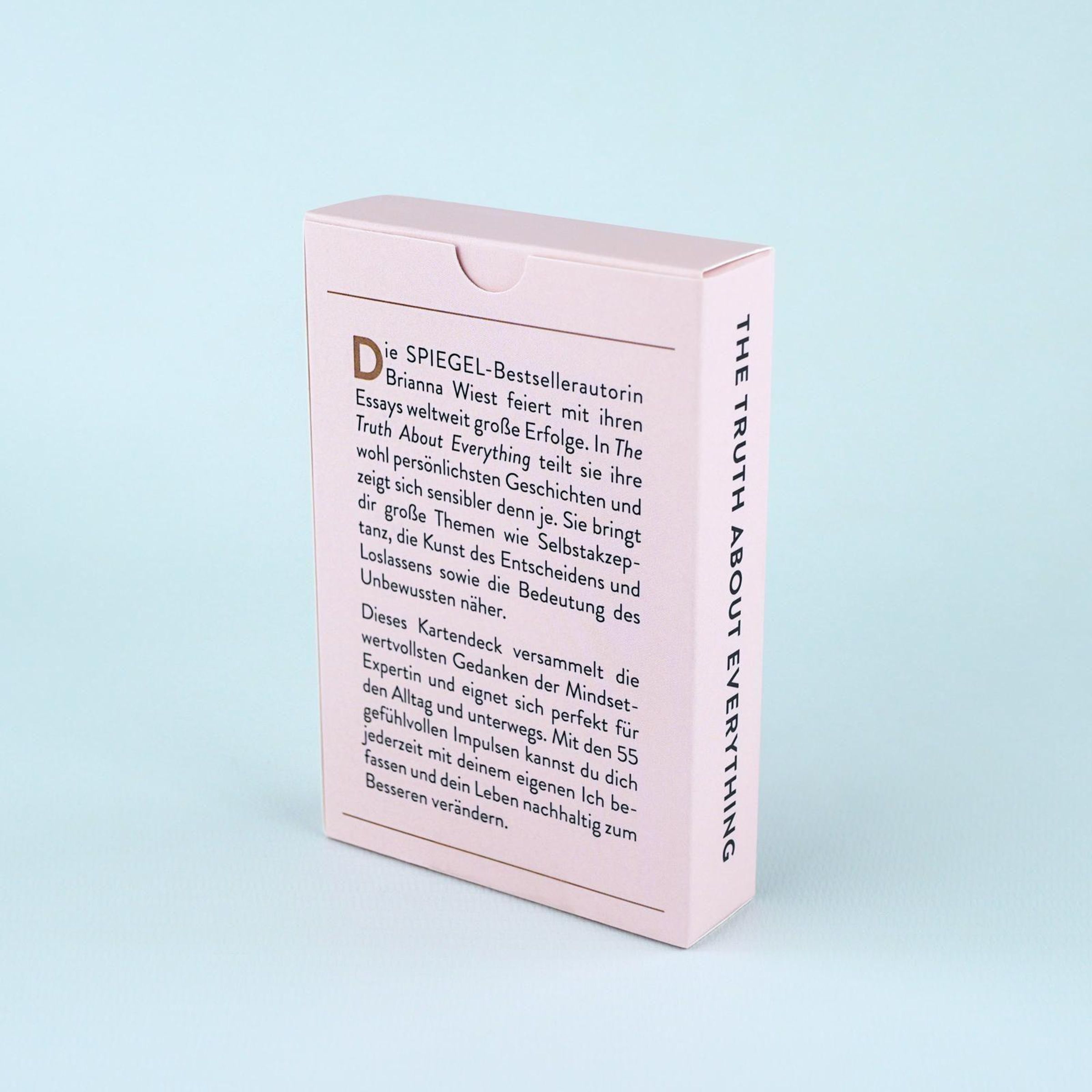 Das wahre Ich erkennen Weltweit feiert die 'SPIEGEL'-Bestsellerautorin Brianna Wiest mit ihren Essays große Erfolge. In ihrem Buch 'The Truth About Everything' wagt sich die Schriftstellerin an ihre wohl persönlichsten Geschichten, in denen sie sich selbst so sensibel wie nie zeigt und ihren Leser*innen große Themen wie Selbstakzeptanz, die Kunst des Entscheidens und Loslassens oder die Bedeutung des Unbewussten näherbringt. Dieses Kartendeck versammelt die wertvollsten Aussagen der Mindset-Expertin und eignet sich perfekt für den Alltag und unterwegs. So kann man sich jederzeit mit dem eigenen Ich befassen und sein Leben nachhaltig zum Besseren verändern.
