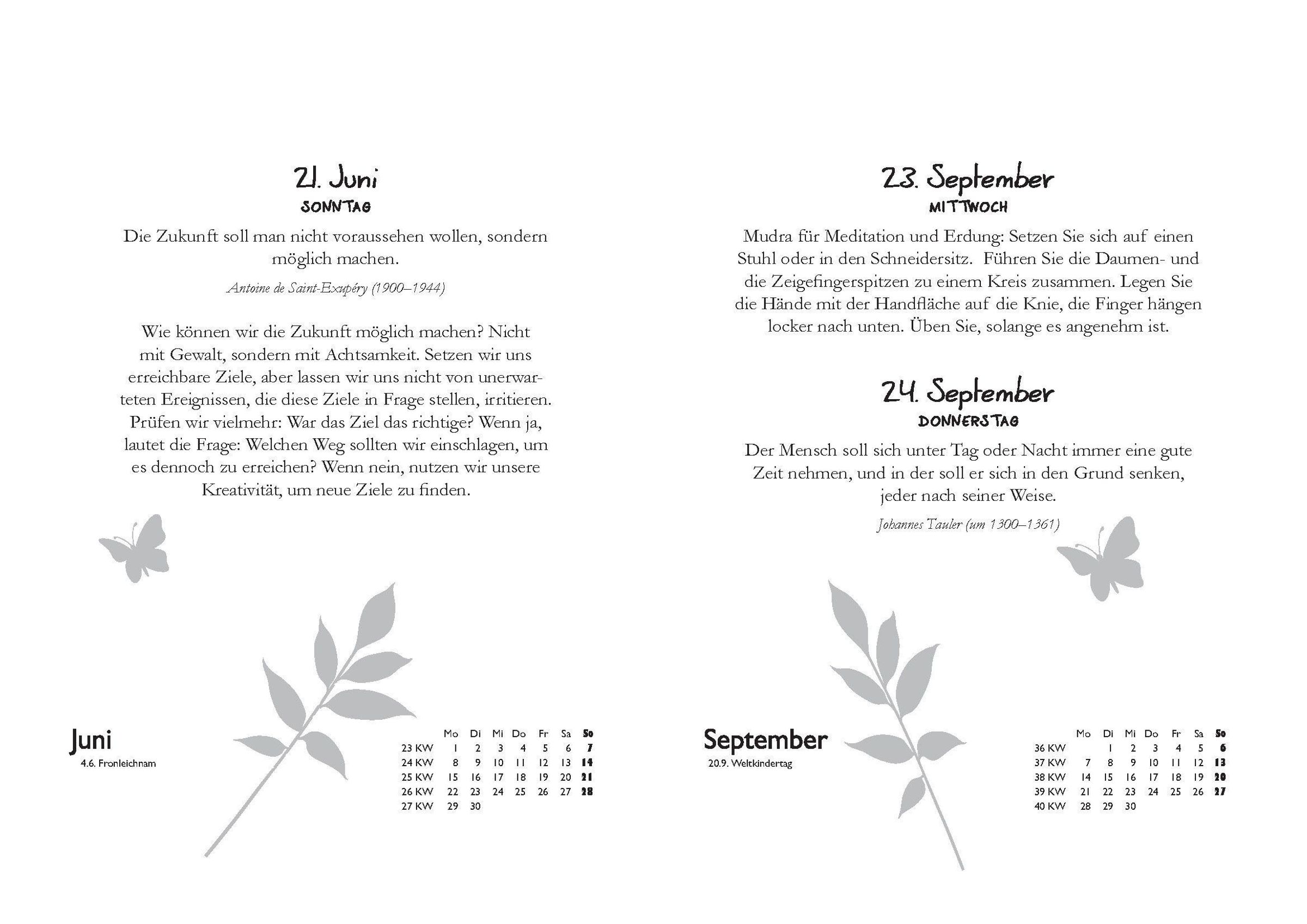 Um die Alltagsprobleme besser bewältigen zu können, wünschen sich viele mehr Gelassenheit. Achtsamkeit ist ein wunderbarer Weg, um auch bei Stress und hohen Anforderungen entspannt zu reagieren oder zu bleiben. Tag für Tag bietet dieser Kalender Anregungen, Übungen und Aphorismen, die eine bessere seelische Balance ermöglichen und die zu einer entspannten Akzeptanz des täglichen Lebens und mehr Achtsamkeit in allen Bereichen führen.