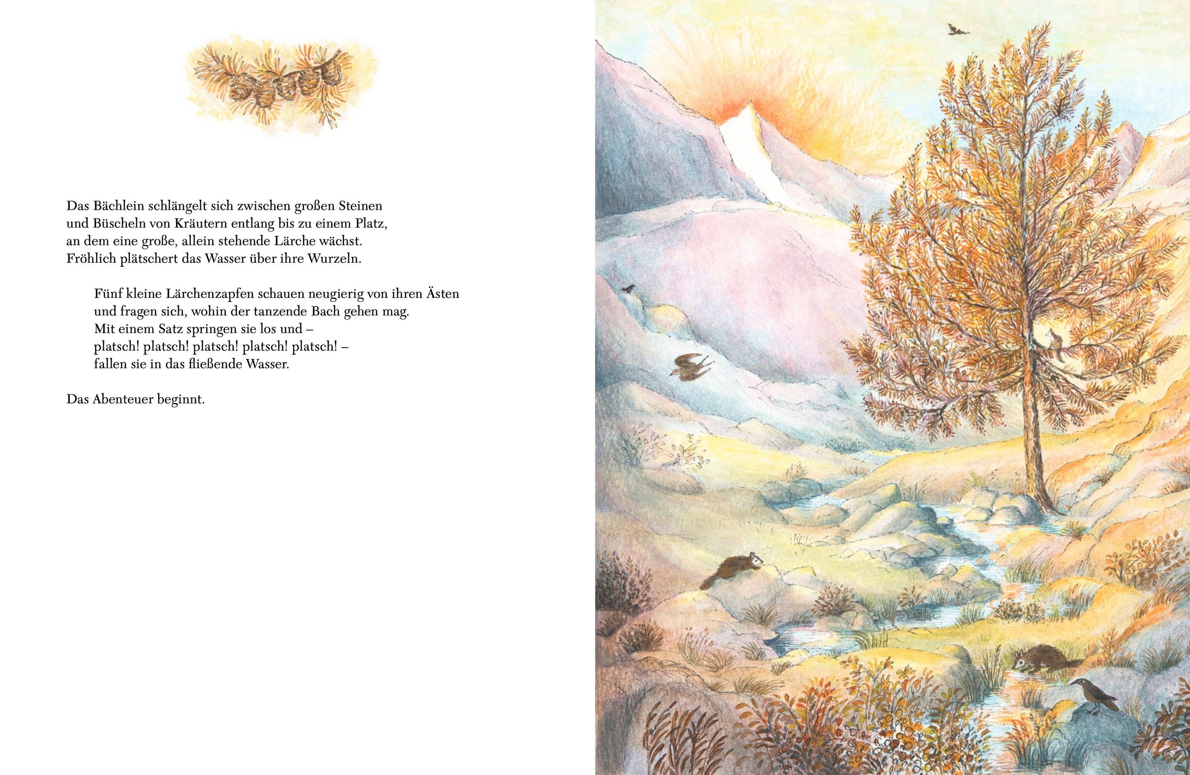 Hoch oben in den Bergen plätschert Wasser aus einer Quelle. Aus dem Rinnsal wird ein Bach, der munter zu Tal fließt und fünf Lärchenzapfen auf eine abenteuerliche Reise mitnimmt. Sie überwinden Wasserfälle, durchqueren Täler und Städte, und immer wieder entdeckt einer der Zapfen einen Ort, wo es ihm gefällt und er ein Zuhause findet. Bevor der letzte Zapfen auf das endlose Meer hinaustreibt, spült ihn eine Welle ans Ufer. Was wird er dort erleben?