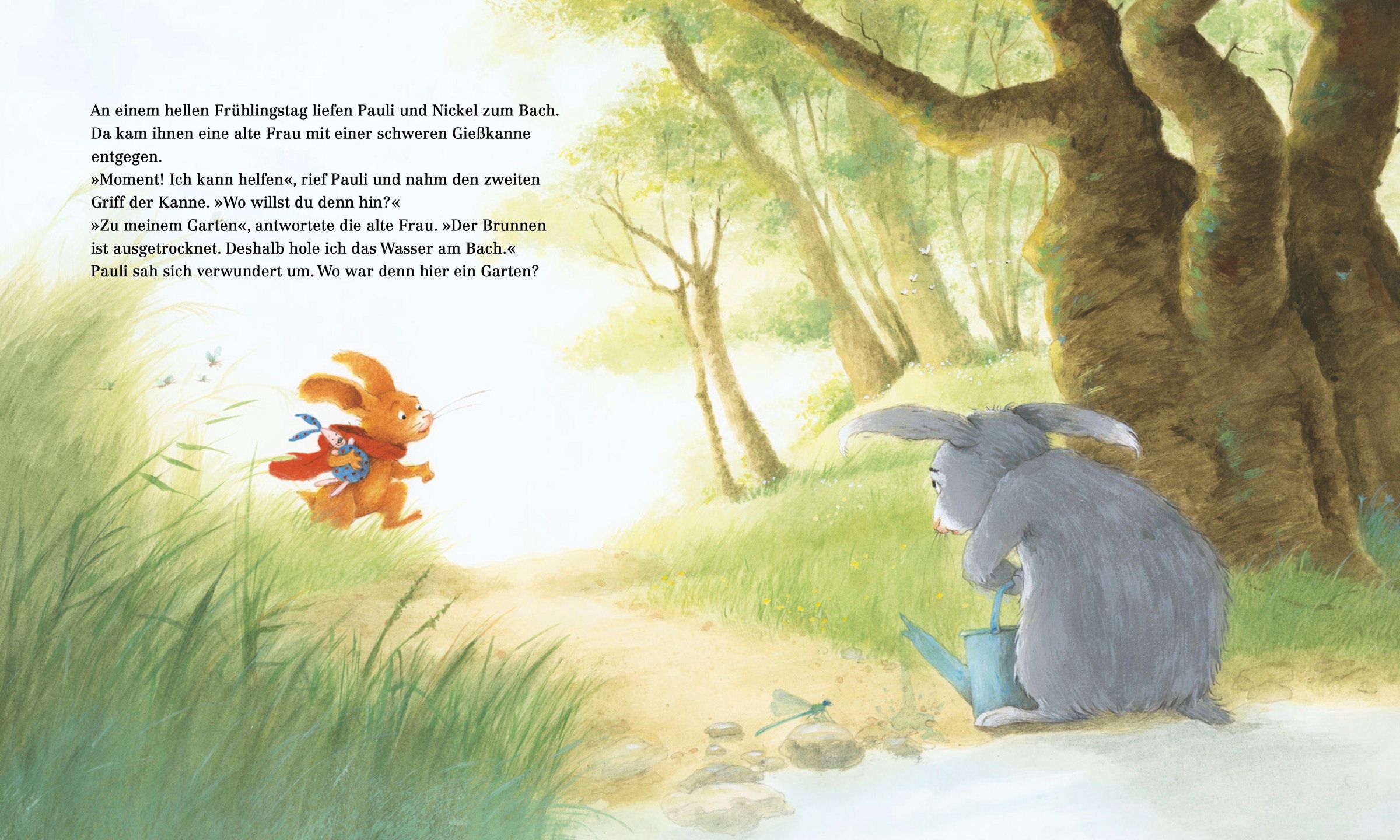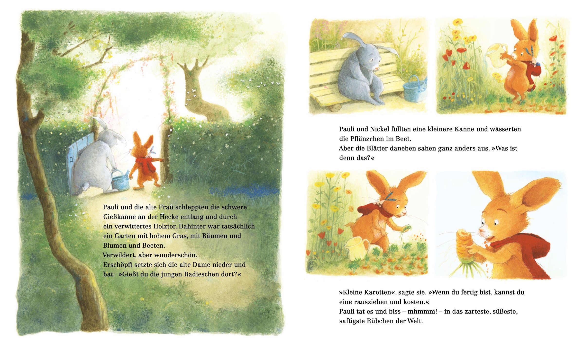 In Paulis Nachbarschaft gibt es einen verwilderten Garten. Die ältere Kaninchendame, die den Garten pflegt, braucht dringend Hilfe. All die schönen Pflanzen müssen regelmäßig gegossen werden, aber für sie ist die Gießkanne zu schwer geworden. Pauli hilft gern und trommelt seine ganze Familie zusammen. Gemeinsam schaffen sie einen Garten, der allen offensteht.
