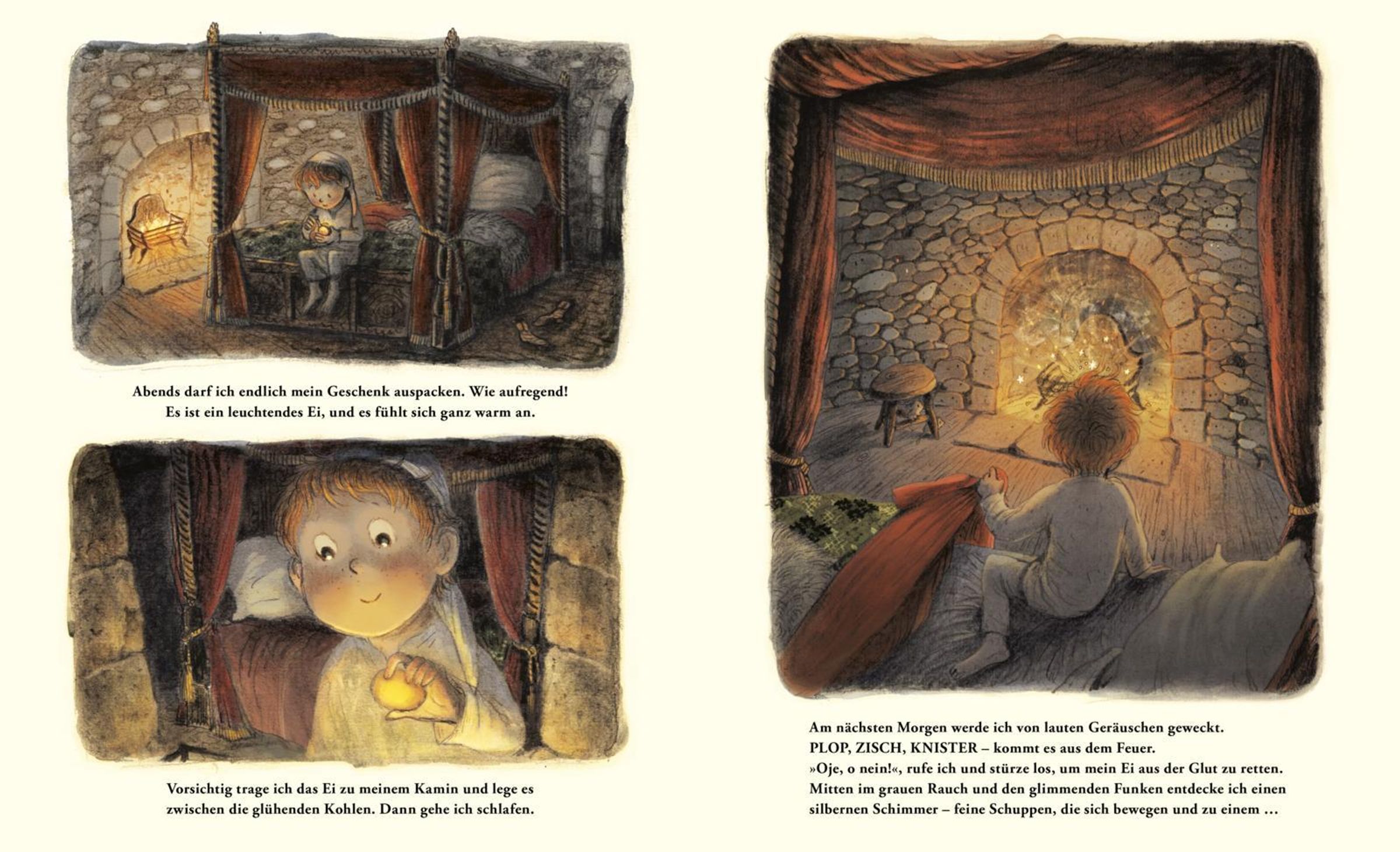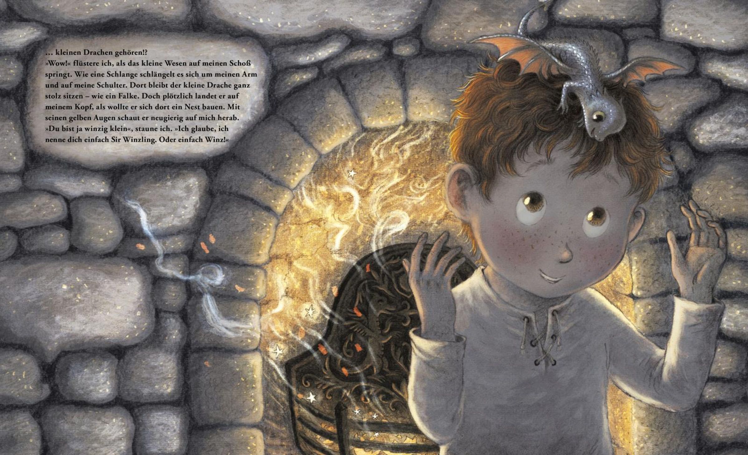 "Leo und der geheime Drache". Ein Junge auf einem Drachen; Er macht eine Ruhe-Geste. Der Drache speit Feuer., Buch
