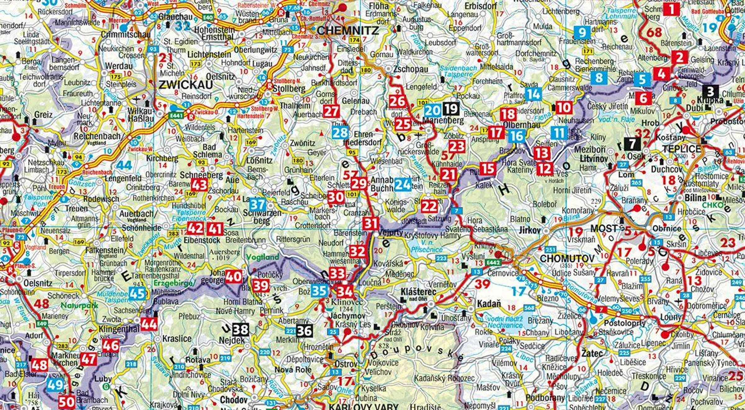 - 50 Höhenprofile, 50 Wanderkärtchen im Maßstab 1:50.000 und 1:75.000 sowie zwei Übersichtskarten im Maßstab 1:500.000 und 1:850.000