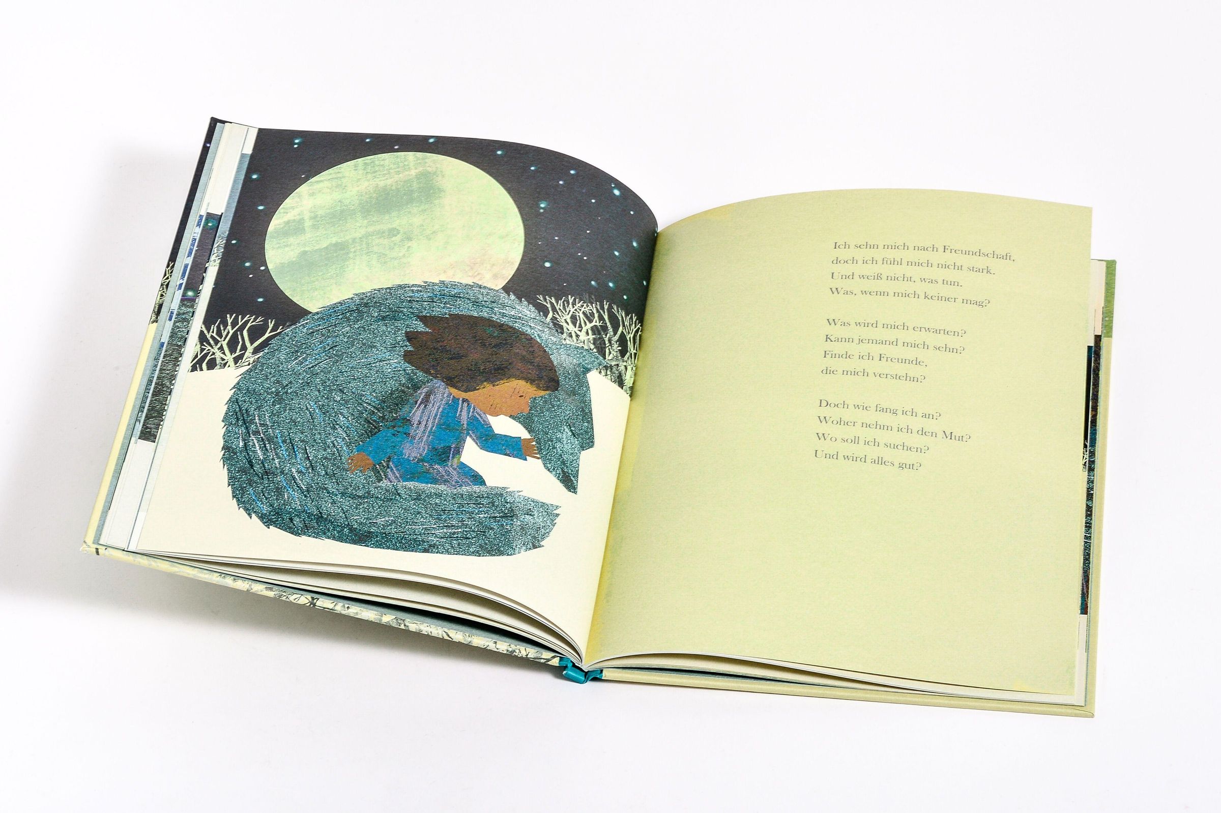 Zwar ist das Gefühl, allein zu sein, ganz natürlich und jeder und jede kennt es. Doch kann es auch sehr beunruhigend und beängstigend sein, wenn sich ein Kind einsam fühlt. Mit der für sie charakteristischen Sensibilität erkundet Britta Teckentrup solche Momente, in denen die Welt weit entfernt scheint und wir mit der schweren Stille kämpfen, die uns umgibt, wenn sich die Einsamkeit wie ein allumfassender Schatten über uns legt. In einer Welt, in der Kinder wie Erwachsene häufig an solchen intensiven Gefühlen leiden, bietet dieses Buch eine ruhige, mitfühlende und verständnisvolle Stimme, die jungen Leser*innen hilft, ihre Gefühle zu erkennen und zu benennen. Das Buch vermittelt Kindern, dass Einsamkeit zwar traurig und schwierig sein kann, aber ein Teil des Lebens ist, den jede*r erlebt. Und es bietet einen Hoffnungsschimmer: auch in den dunkelsten Momenten liegt vor uns die Möglichkeit von Licht und Verbindung.