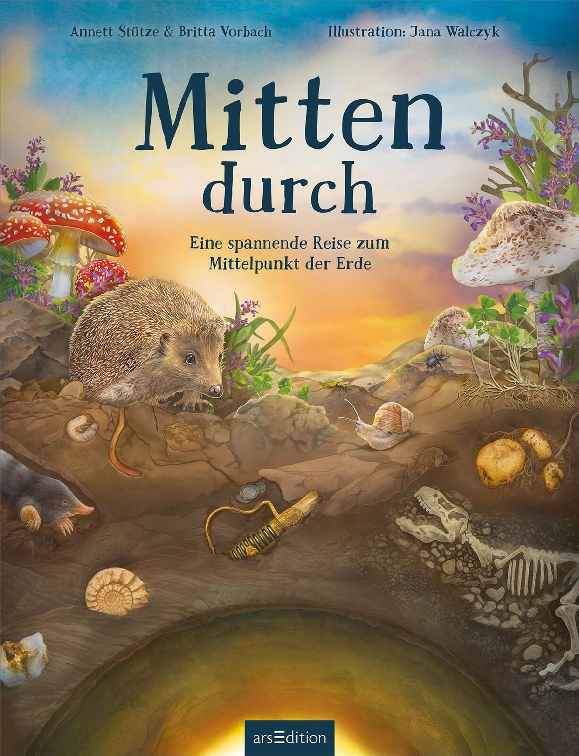 "Mitten durch. Eine spannende Reise zum Mittelpunkt der Erde." Ein Igel, Maulwurf und Pflanzen, darunter Erdschichten., Buch