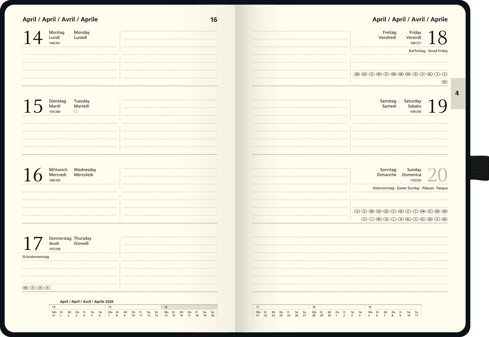 Blattgröße: 148 × 210 mm ? 2 Seiten = 1 Woche ? 144 Seiten, Druckfarbe Kalendarium: schwarz ? 80 g / m², Qualitätspapier, cremefarben, tintenfest, Fadenheftung ? viersprachig: deutsch, englisch, französisch, italienisch ? PU-Einband, Farbe: pink ? Jahresübersicht aktuelles Jahr und 2 Folgejahre, 4 Seiten Monatsplan aktuelles Jahr, 6 Seiten Monatsplan Folgejahr, Ferientermine Deutschland und Österreich, 3 Seiten Notizen liniert, 16 Seiten Notizen blanko perforiert, auswechselbares Adressheft, 16 Seiten ? Gummizugverschluss ? mit Einstecktasche und Stiftschlaufe ? Zeichenband ? für Kalenderjahr 2026