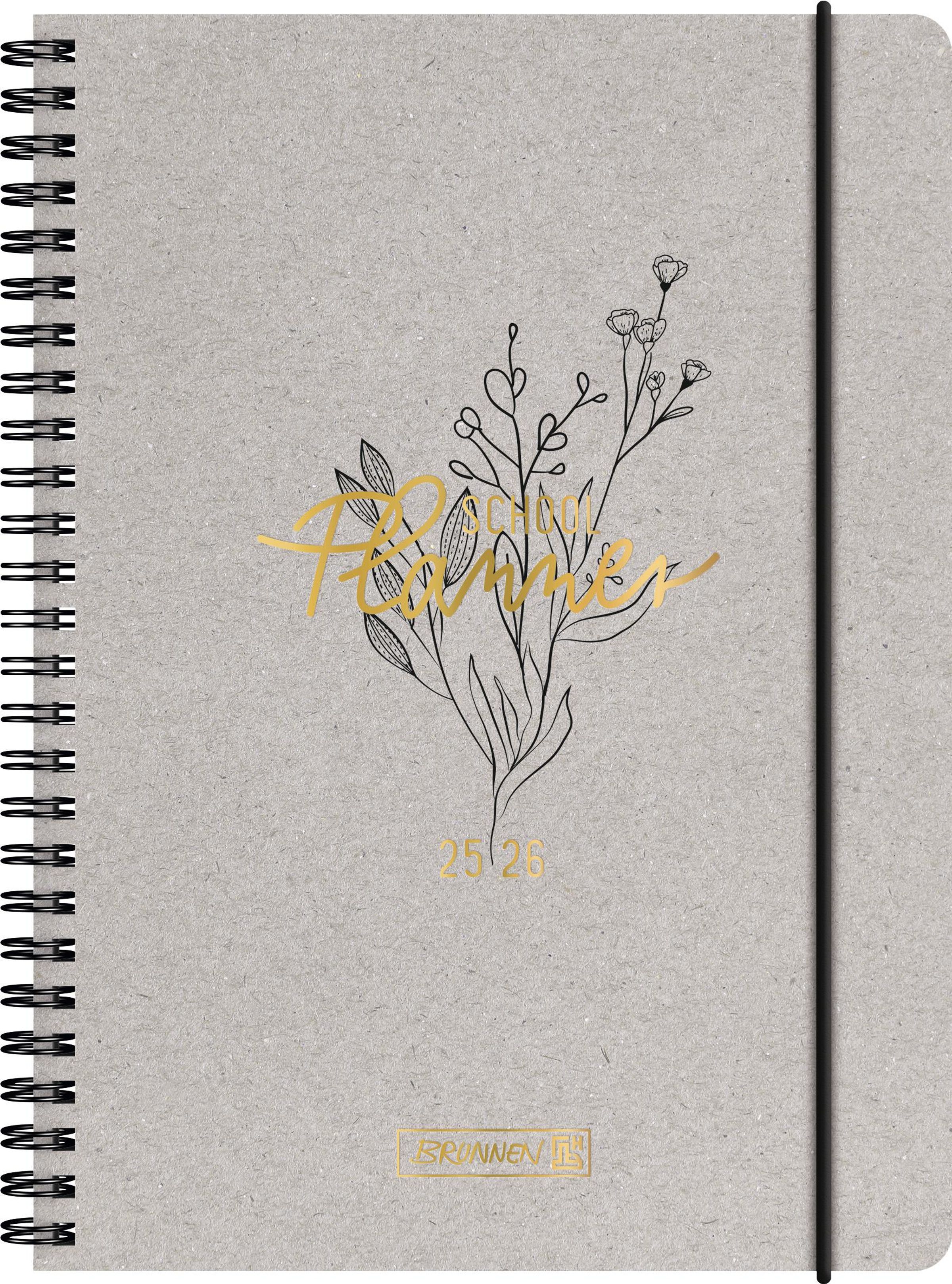 BRUNNEN Schülerkalender (2025/2026) "Botanical", 2 Seiten = 1 Woche, A5, 208 Seiten, Naturkarton-Umschlag, grau, Gebunden