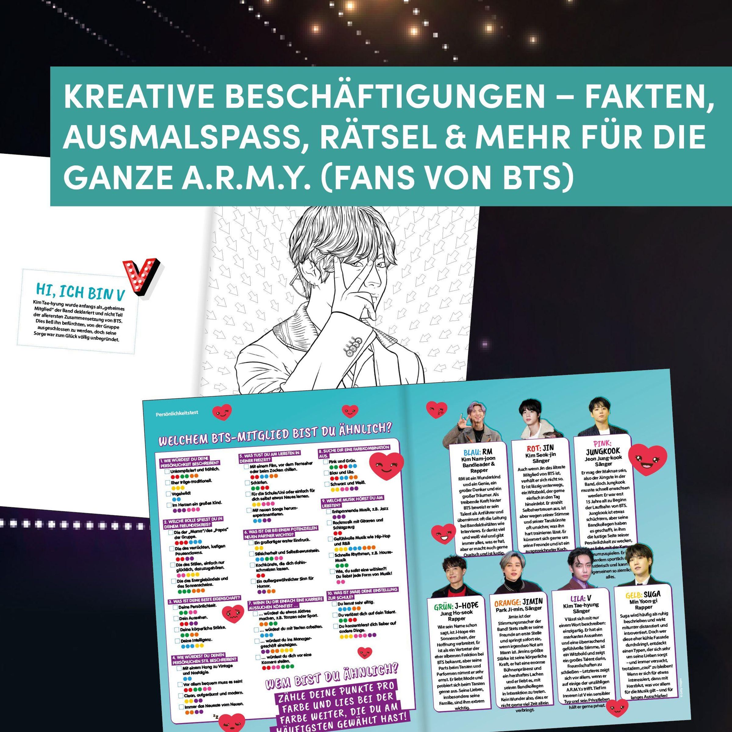 In diesem SUPER FAN-tastischen Kreativbuch erwarten dich über 35 Ausmal-Seiten , spannende Tests zu deinem Fan-Wissen sowie lustige und herausfordernde Spiele und Rätsel . Von Finde-den-Unterschied-Bilderrätseln über Wortsuchen bis hin zu kniffligen Aufgaben - alles dreht sich um BTS und ihre Bandgeschichte . Zusätzlich bekommst du interessante Fakten zu jedem Bandmitglied und zur Entwicklung der Band - perfekt für alle, die BTS lieben und mehr über ihre Idole erfahren möchten.