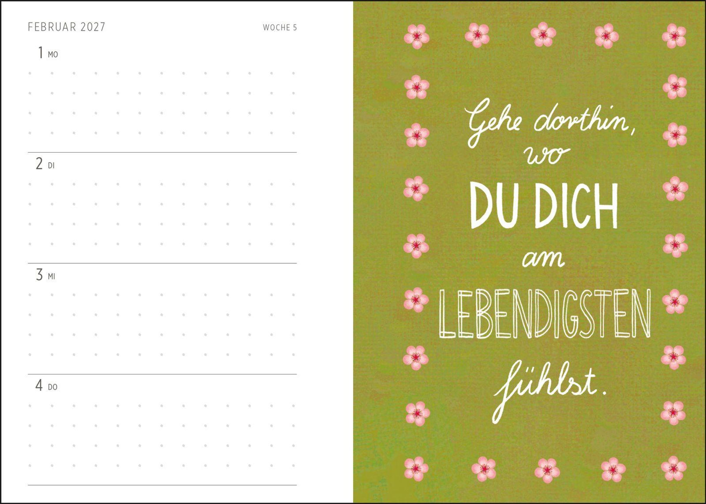 Blumiger Taschenkalender 2027 mit lebensfrohen Sprüchen auf 12 Postkarten