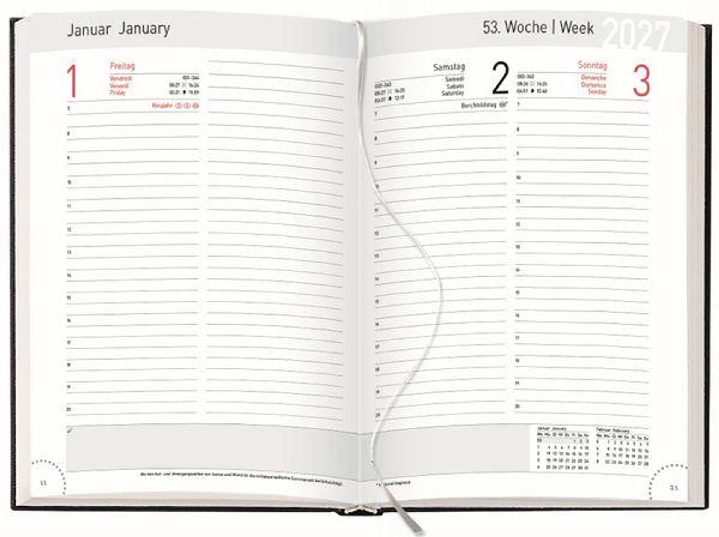 - Lesebändchen sowie praktische Eckperforationen; Anzeige der Mondphasen sowie Aufgangs- und Untergangszeiten von Sonne und Mond